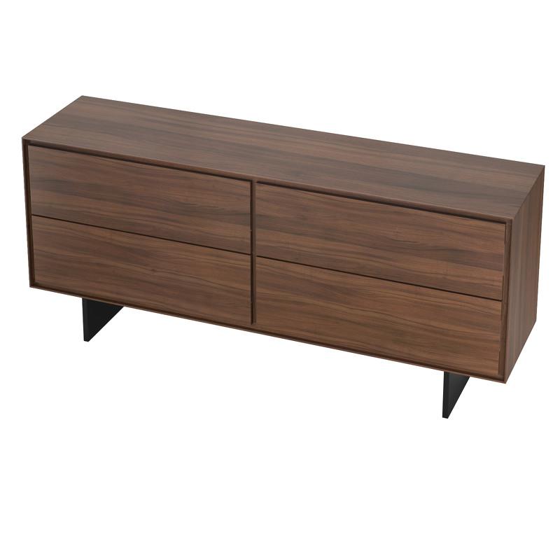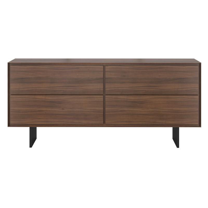 Буфет Miramar от бренда MOD Interiors в современном стиле на высоких ножках. Рисунок натурального шпона всегда индивидуален, что делает эту модель неповторимой. На фасадах сделан ручной подбор рисунка шпона, что значительно повышает уровень продукта. Буфет выполнен из высококачественного, сертифицированного МДФ высокой плотности. Отделка - натуральный шпон северо-американского ореха. Ноги выполнены из метала и окрашены в черный матовый цвет. У комода 6 выдвижных ящика со скрытыми направляющими и механизмом открывания push to open (открывание нажатием).