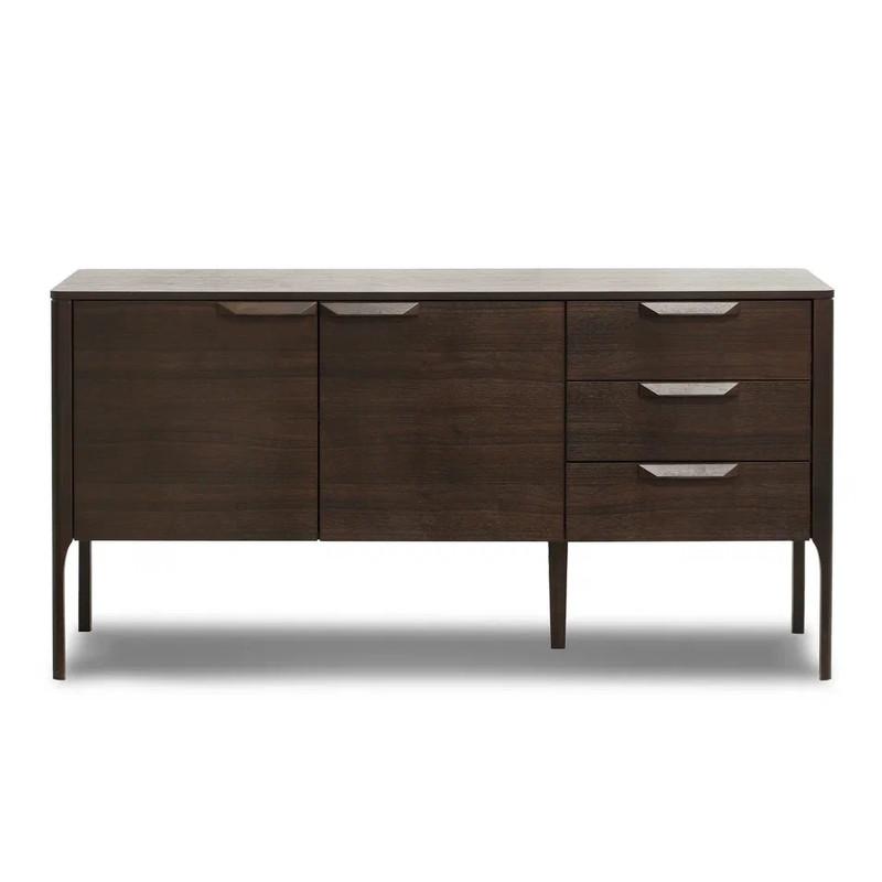 Буфет от бренда MOD Interiors прекрасно впишется в интерьер столовой или гостиной в современном стиле. Корпус буфета изготовлен из высококачественного МДФ высокой плотности. Ножки и ручки буфета выполнены из массива дерева. Отделка - натуральный шпон ореха, тонированного в цвет горького шоколада. Буфет оснащен двумя дверками и тремя выдвижными ящиками. Ящики снабжены системой плавного закрывания Soft closing. Для большей устойчивости буфет оснащен дополнительной ножкой в углублении. Высота ножек 31 см.