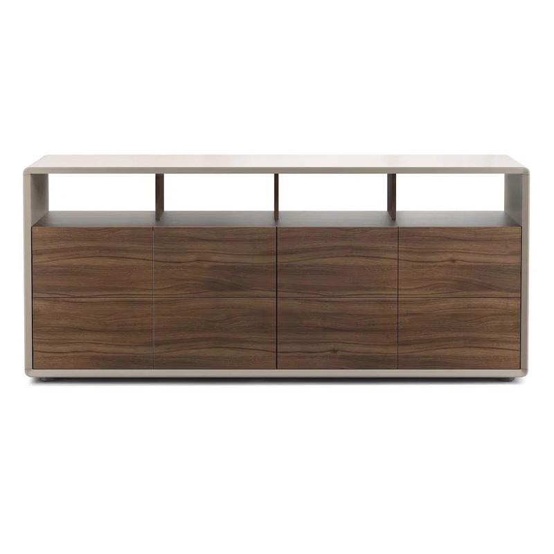 Буфет Olimar от бренда MOD Interiors в современном стиле. Открытая ниша позволяет сделать этот буфет максимально легким и удобным в использовании. Контрастная отделка делает этот предмет мебели очень акцентным в интерьере. Корпус и фасады выполнены из высококачественного МДФ класса Е1. Угловые элементы корпуса - массив дерева. Отделка - натуральный шпон американского ореха и матовый лак светло-бежевого цвета. Буфет с восьмью выдвижными ящиками, что делает его максимально удобным в использовании. Ящики со скрытыми направляющими и современной системой легкого открывания push-to-open (открывание нажатием). Буфет стоит на пяти пластиковых ножках черного цвета. Они углублены и практически незаметны.