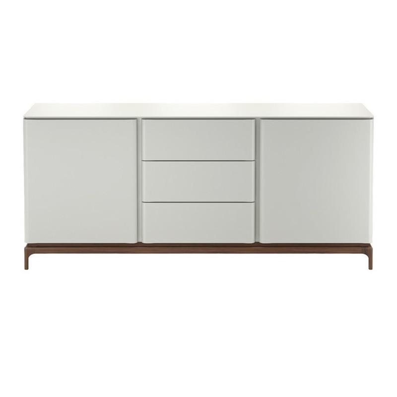 Буфет с двумя дверками и тремя выдвижными ящиками от бренда Mod Interiors. Корпус и столешница буфета выполнены из высококачественного сертифицированного МДФ высокой прочности в отделке матовый лак светло-серого оттенка. База комода изготовлена из массива дерева с покрытием из натурального шпона ореха. Ящики снабжены системой открывания push to open.