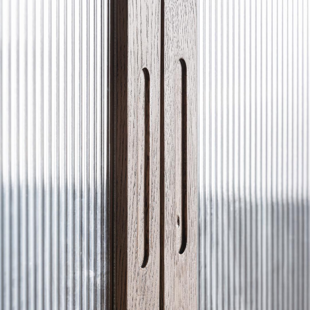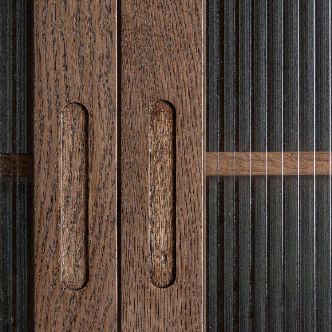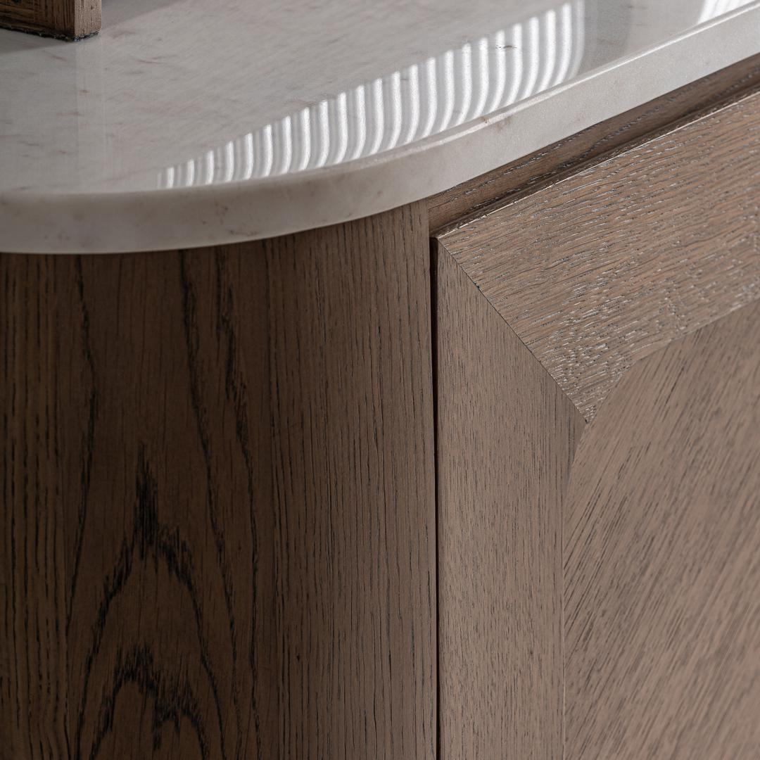 Барный шкаф, изготовленный из дуба коричневого цвета, в сочетании с белым мрамором и прозрачным стеклом. Барный шкаф : ширина 200 см, глубина 54 см, высота 183 см. Витрина : ширина 170 см, глубина 38 см, высота 91 см. Буфет : ширина 200 см, глубина 54 см, высота 92 см.