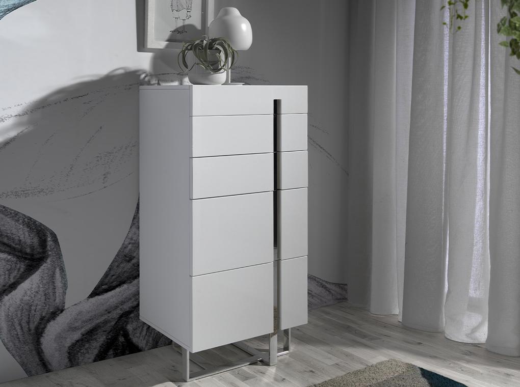 Шифоньер с современным дизайном из DM лакированного в RAL9003 Glossy White и оригинальной структурой ножек и отделкой из нержавеющей стали с хромированием 22 микрон. Элегантный и изысканный стильный шифоньер, идеально подходящий для того, чтобы привнести минималистский и стильный штрих, который вы ищете в своей спальне, а также поддерживать порядок благодаря большому пространству для хранения с пятью ящиками, тремя одинарными и двумя двойными, с системой плавного закрывания. Вспомогательный с прямыми линиями, практичный и функциональный, а также дизайн для вашей комнаты. Отделка - лак RAL9003 Glossy White.