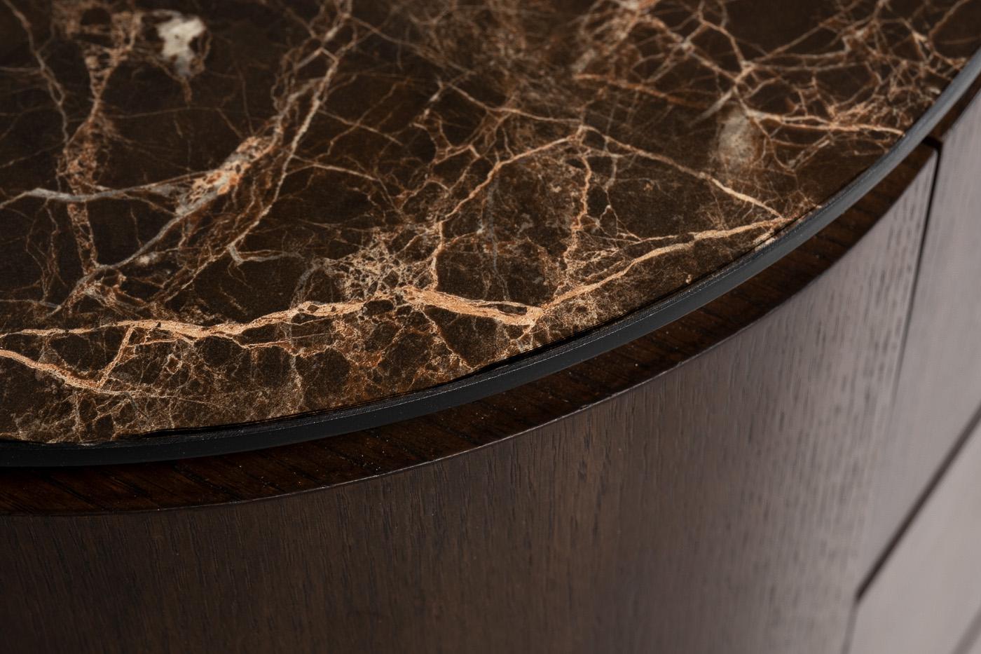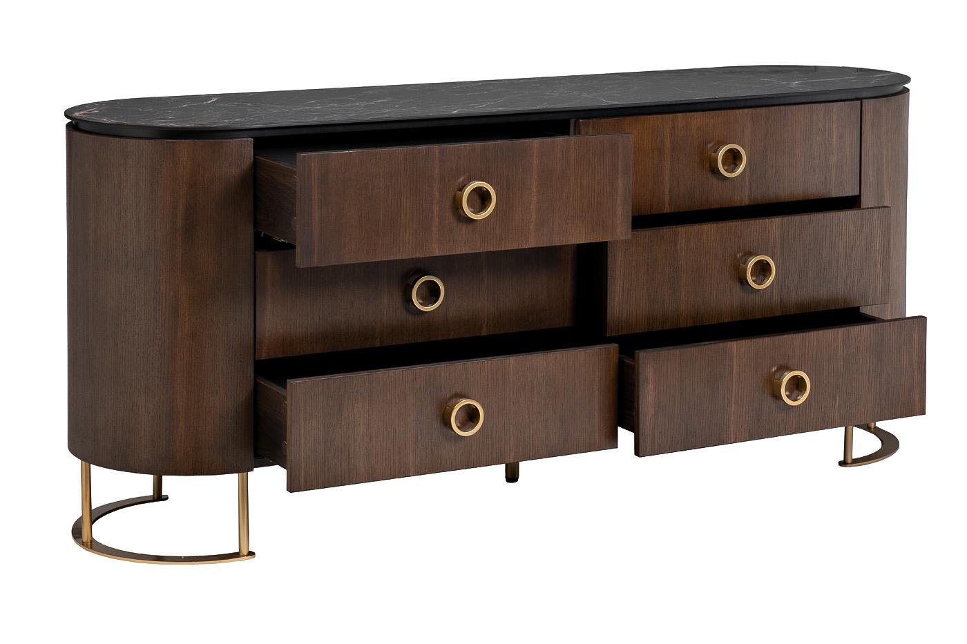 description-full - Лаконичный коричневый комод станет эффектным дополнением интерьера гостиной, спальни, кабинета, прихожей. Его фишка – необычная округлая форма, которая добавляет мебели изысканности и шарма. Оригинальные опоры из металла и стильная фурнитура привлекают к себе внимание, но главным декоративным акцентом является столешница из керамогранита. Красивый комод с ящиками легко компонуется с другой мебелью и оптимально подойдет в качестве тумбы под ТВ. Вместительный и практичный, он станет отличным местом для хранения вещей, одежды и текстиля. В фирменных магазинах бренда Garda Decor можно купить комод в спальню, мебель и аксессуары в стиле ар-деко с доставкой.