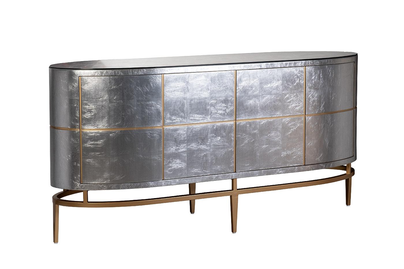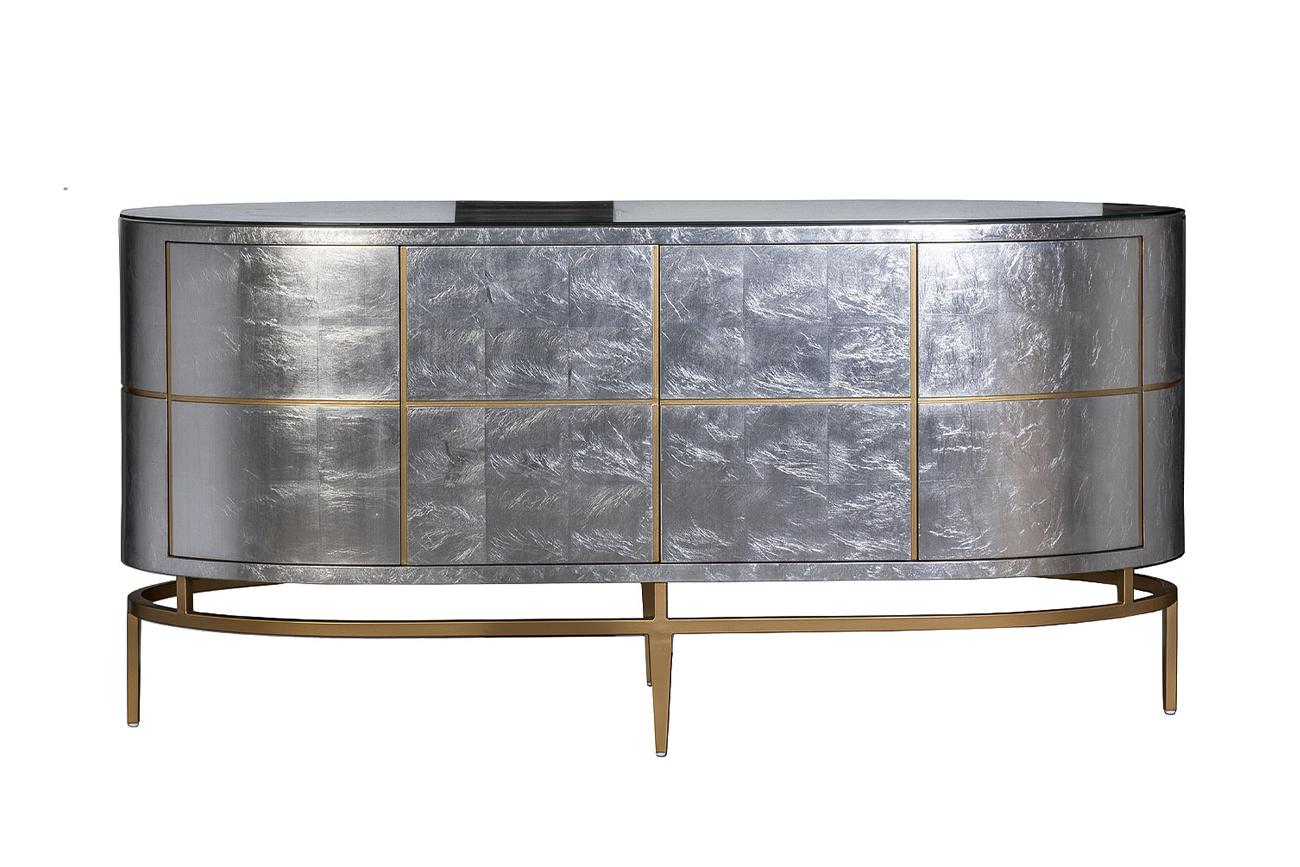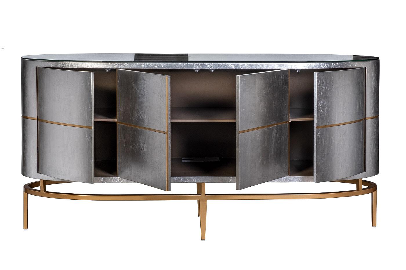 description-full - Футуристичный дизайнерский комод потрясает чистотой линий и минималистичностью форм. В начале ХХ века для произведений живописи и архитектуры в стиле футуризма были характерны длинные динамические линии и чистые геометрические формы, предполагающие новый уклад жизни, движение и обновление. Вертикальные и горизонтальные вставки золотисто-медного цвета, овальная опора с ножками, перекликающаяся с формой комода, делают его удивительно современным, при этом создавая вполне ощутимую иллюзию стиля 10-х годов прошлого века. Корпус комода покрыт тончайшими листьями серебристой фольги и покрыт сверху лаком по авторской технологии. Четыре распашные дверцы с механизмом push-to-open открывают доступ в два боковых и одно центральное отделение с полкой. В комплект входит дополнительная стеклянная столешница, защищающая поверхность от царапин. Комод прокрашен и залакирован со всех сторон, чтобы устанавливать его в любом месте помещения. Дополните комод кофейным или журнальным столиками арт. ART-...