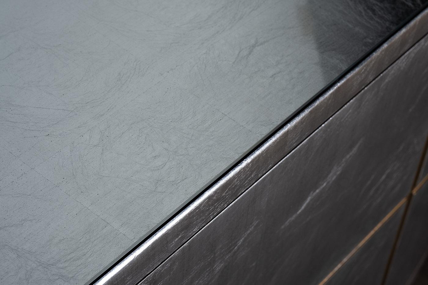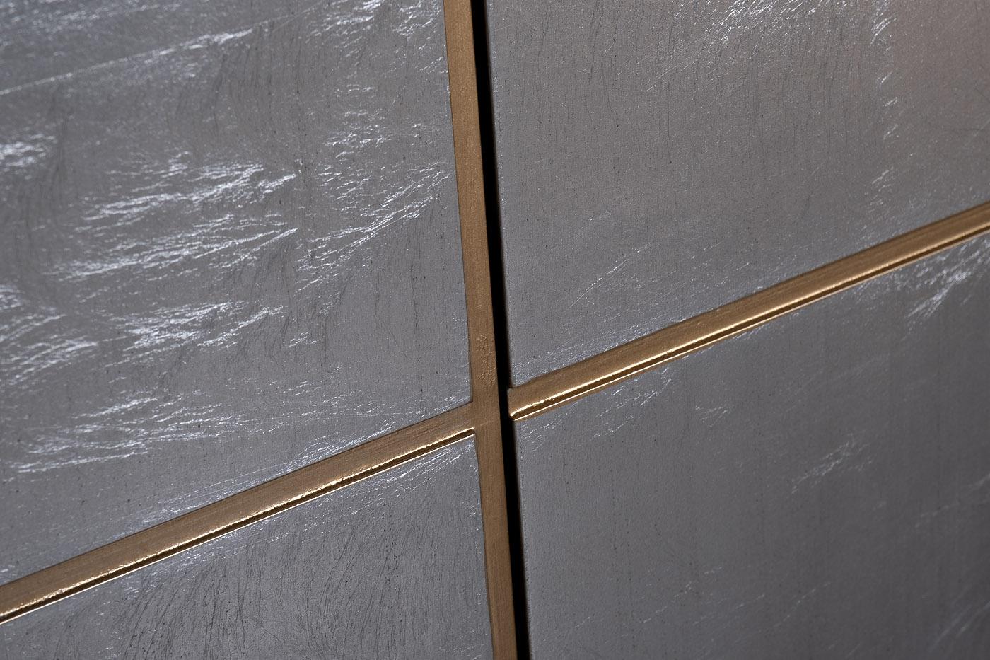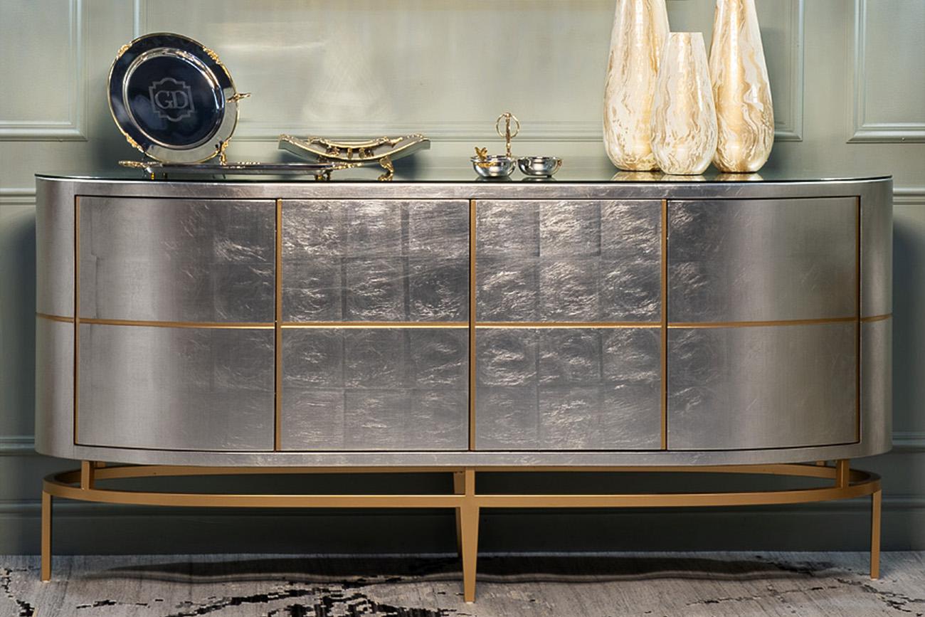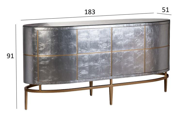 description-full - Футуристичный дизайнерский комод потрясает чистотой линий и минималистичностью форм. В начале ХХ века для произведений живописи и архитектуры в стиле футуризма были характерны длинные динамические линии и чистые геометрические формы, предполагающие новый уклад жизни, движение и обновление. Вертикальные и горизонтальные вставки золотисто-медного цвета, овальная опора с ножками, перекликающаяся с формой комода, делают его удивительно современным, при этом создавая вполне ощутимую иллюзию стиля 10-х годов прошлого века. Корпус комода покрыт тончайшими листьями серебристой фольги и покрыт сверху лаком по авторской технологии. Четыре распашные дверцы с механизмом push-to-open открывают доступ в два боковых и одно центральное отделение с полкой. В комплект входит дополнительная стеклянная столешница, защищающая поверхность от царапин. Комод прокрашен и залакирован со всех сторон, чтобы устанавливать его в любом месте помещения. Дополните комод кофейным или журнальным столиками арт. ART-...