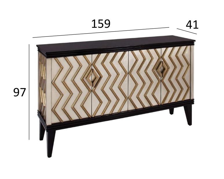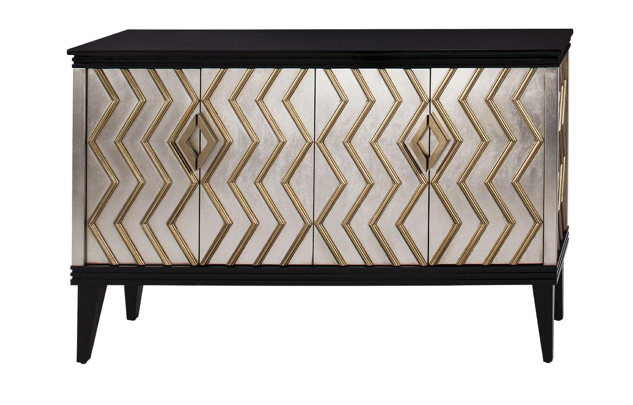 description-full - Дизайнерский комод ручной работы с геометрическим рисунком выполнен в духе биметаллической гостиной Форсайтов 10-х годов прошлого века. Фасад корпуса отделан тончайшей фольгой цвета старого золота и серебра и дополнительно прокрашен вручную по специальной технологии; тщательная отделка каждой детали придает ему особую индивидуальность. В комоде два отделения с вместительной полкой и четырьмя дверцами. На столешнице из натурального черного гранита будут великолепно смотреться вазы и изящные безделушки. Комод прекрасно впишется в интерьер в стиле ар-деко, богемный шик или фьюжн, добавляя артистизм и буржуазный лоск в обстановку. У нас вы можете приобрести барный шкаф арт. ART-1973-S2, прикроватные тумбочки арт. ART-1973-E, тумбу для телевизора арт. ART-1973-TV и консоль арт. ART-1973KONS из этой же серии, чтобы меблировать гостиную, спальню или столовую в едином стиле.