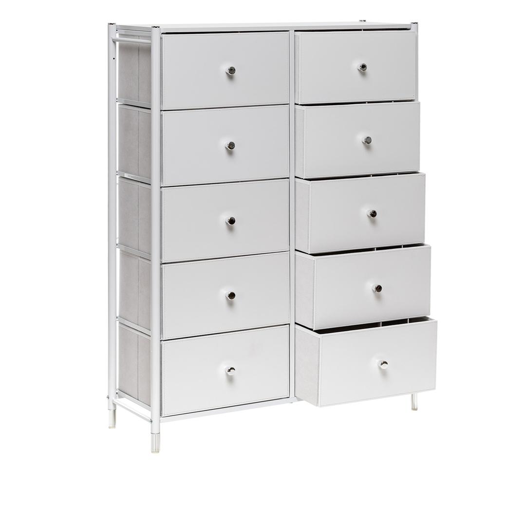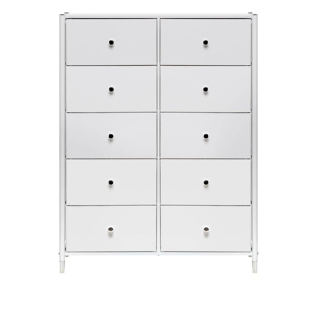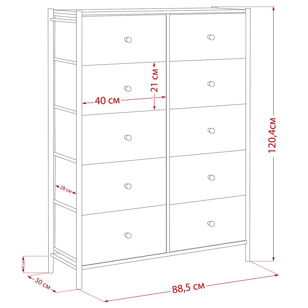 Комод с ящиками Leset «Хайди 10» – это конструкция, обеспечивающая много места для хранения, при этом занимает мало места. Будет уместен в любом помещении и даже в ванной комнате из-за водоотталкивающей пропитке на столешнице. Модульный комод изготовлен из металлического каркаса и имеет надежные пластиковые ножки, которые сберегут пол, а также помогут отрегулировать комод по высоте. Ящики – экокожа с металлическими ручками-кнопками и нетканый материал – спанбонд, благодаря которому один ящик выдерживает 10 кг. Преимущества: • Модульность – сочетается с другими комодами Нирита; • Быстрая сборка – 10 минут. Рекомендуем прикручивать комод к стене с помощью шурупов (идут в комплекте), согласно инструкции. Это исключит возможность опрокидывания комода (особенно важно для детских комнат и помещений с маленькими детьми).
