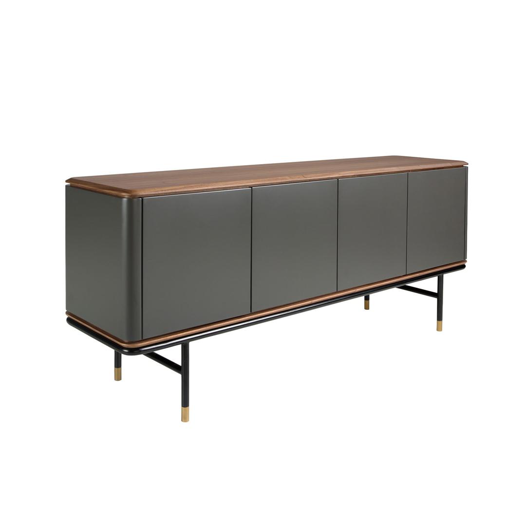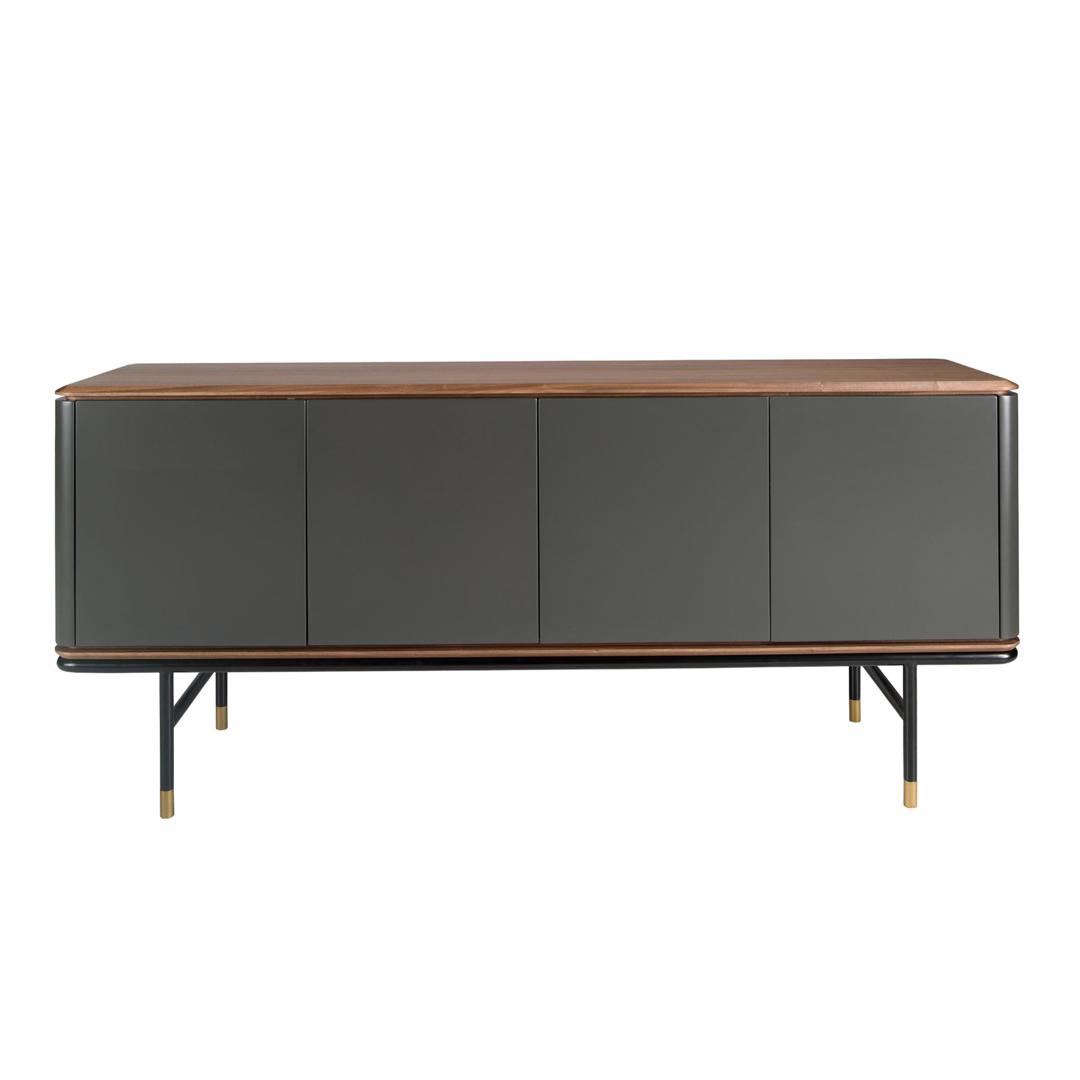Современный дизайн буфета с темно-серой структурой из МДФ с матовой отделкой и оригинальными черными ножками из нержавеющей стали. Благодаря элегантной столешнице из натурального орехового шпона вы получите изысканный вид, который ищете в своих комнатах. Его оригинальные золотистые полированные детали из нержавеющей стали добавят идеальный штрих стиля в вашу гостиную. Он имеет достаточно места для хранения с 4 дверцами с системой открывания и закрывания push-and-pull.