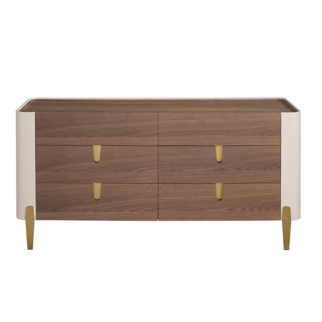 Сервант с современным дизайном с натуральной структурой из орехового шпона и бежевым лакированным МДФ, а также оригинальными полированными ножками из нержавеющей стали золотистого цвета. Благодаря элегантной столешнице из натурального орехового шпона вы получите изысканный вид, который ищете в своих комнатах. Его оригинальные золотистые полированные детали из нержавеющей стали добавят идеальный штрих стиля в вашу гостиную. Он имеет достаточно места для хранения с 6 ящиками с ручным открыванием с помощью выемки для пальцев и системой плавного закрывания.