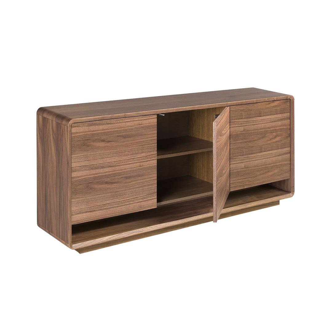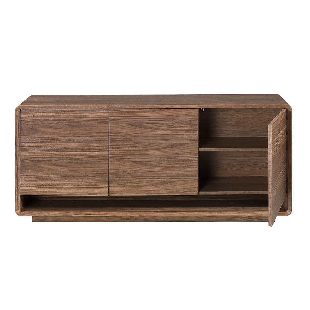 Современный дизайнерский буфет с каркасом из натурального орехового шпона и оригинальным основанием из шпона орехового цвета. Он имеет вместительное отделение для хранения вещей и 3 дверцы с системой открывания и закрывания «нажать и потянуть».
