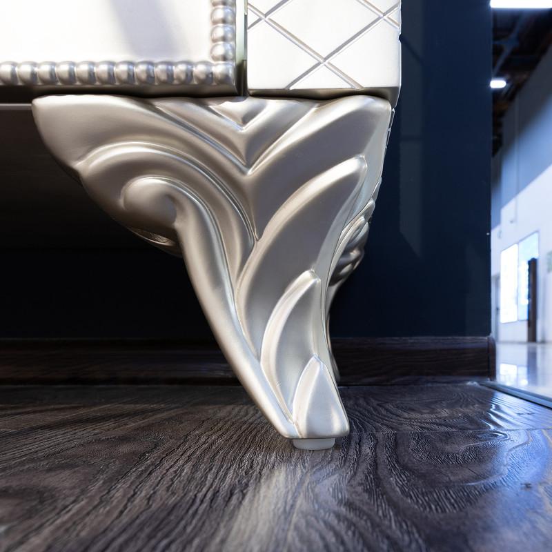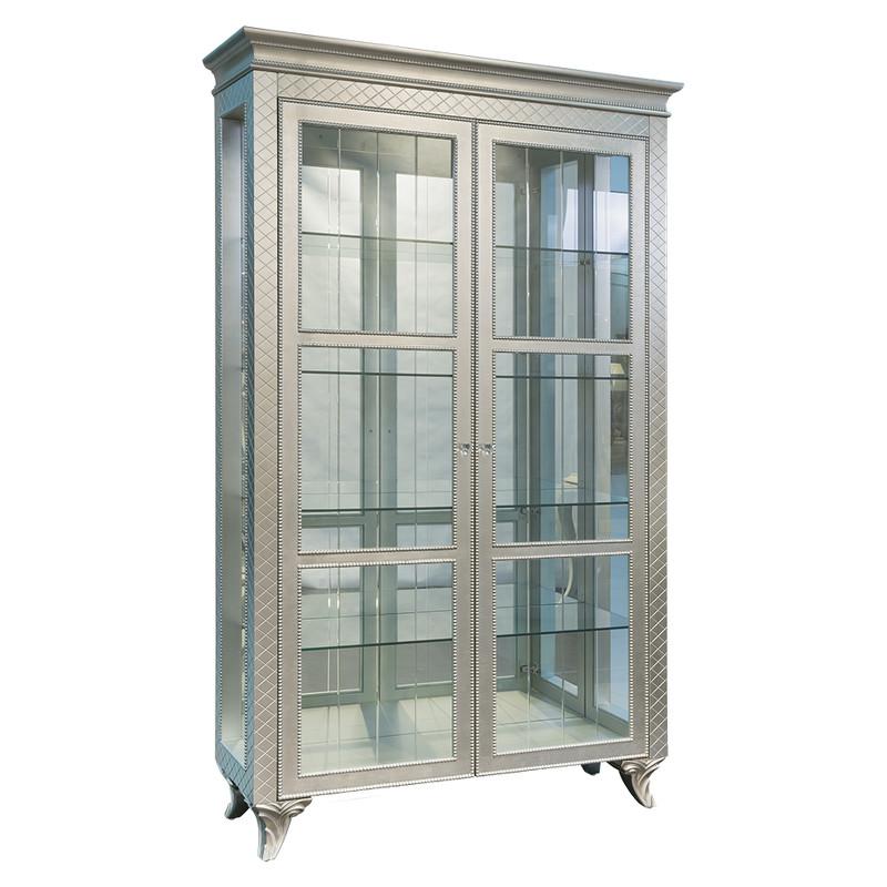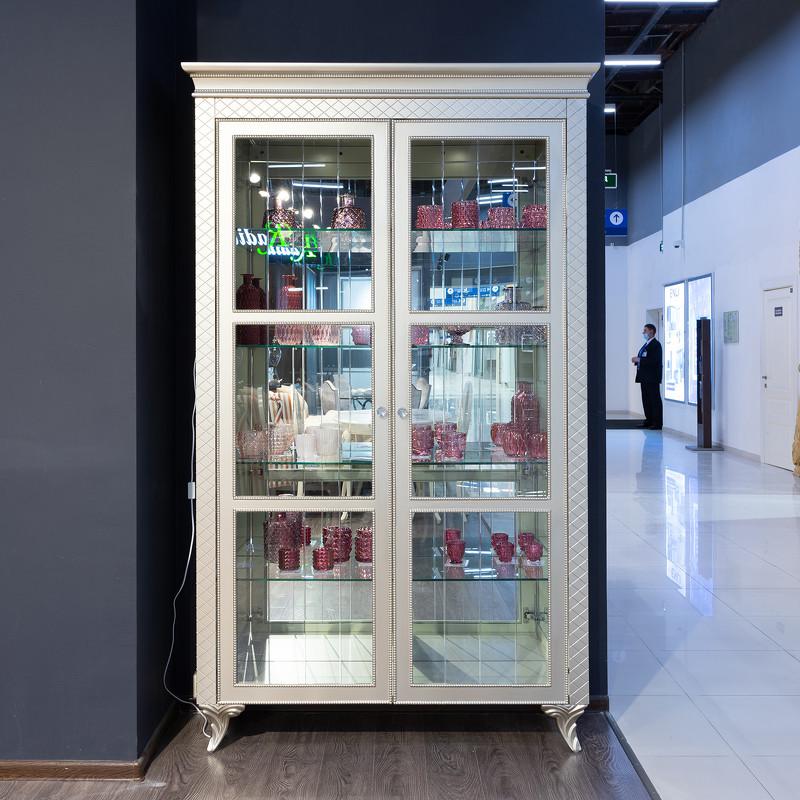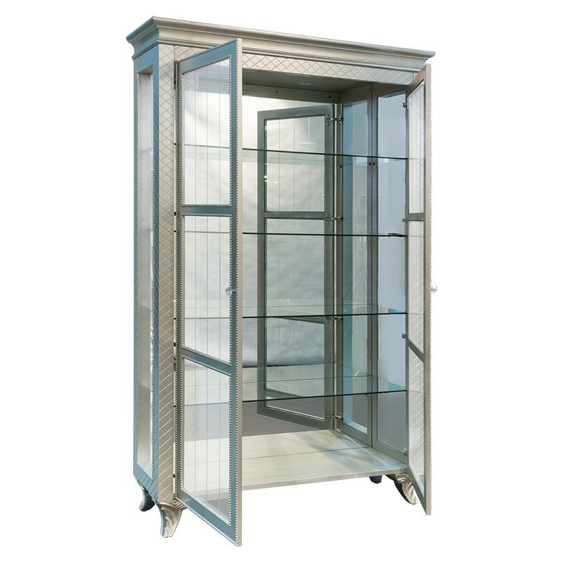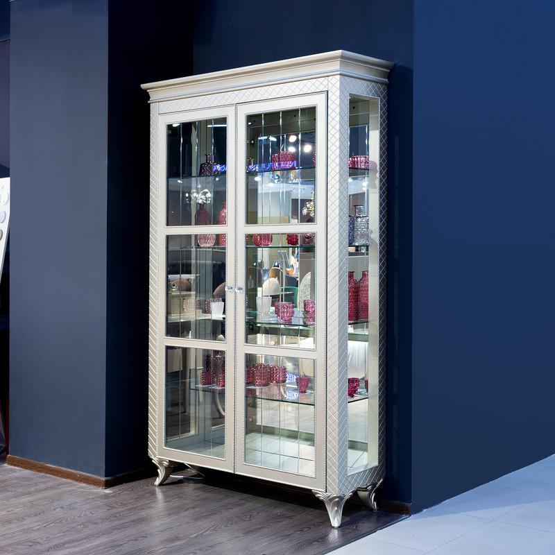 Витрина Flopence от итальянского бренда Fratelli Barri выполнен в стиле близком к классическому. Увеличенные размеры витрины делают ее отдельным арт-объектом, притягивающим все взгляды. Серебряная отделка придает мебели этой коллекции особенную привлекательность. Акцентные ручки хрусталики. Прямые детали корпуса выполнены из МДФ класса Е1. Ножки - из массива дерева. Отделка серебряное напыление, покрытое лаком. Окрашивание и декорирование витрины делается вручную. 2 распашные дверки. Внутреннее наполнение 4 стеклянных полки из закаленного стекла. Дверки и боковые стенки из закаленного стекла в раме декорированной ромбовидной разметкой. Задняя стенка витрины - зеркальная. Подсветка - 2 точечных светильника.