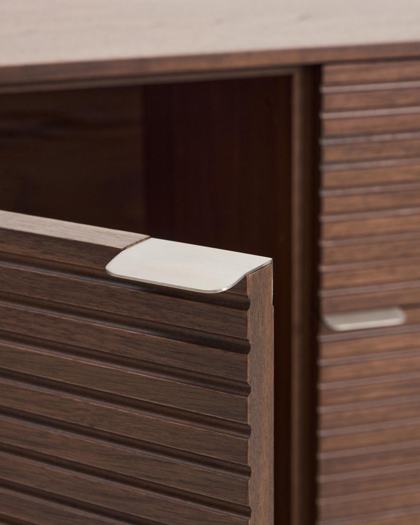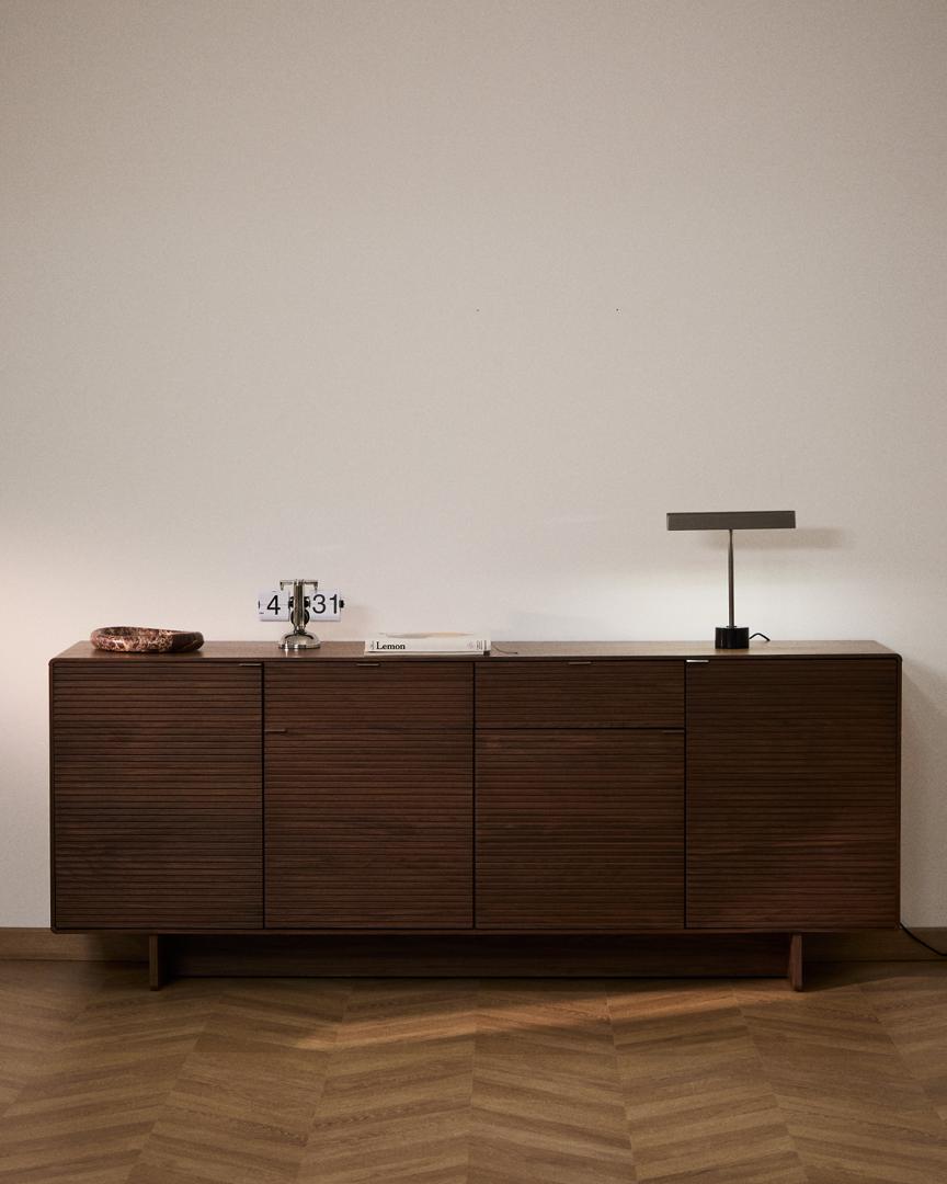 Norlen отдаёт дань уважения дизайну 1950-х годов в современной интерпретации, сочетая минималистичные формы и винтажные детали. Слегка закруглённые углы и деревянное основание создают ностальгическую атмосферу, переосмысленную благодаря чистым линиям и современным пропорциям. Тёмный ореховый шпон, нанесённый методом вакуумной мембранной печати, идеально подходит к радиусам мебели, объединяя отделку и придавая глубину и индивидуальность каждому предмету. Он покрыт полиуретановым лаком, обеспечивающим устойчивость к износу и влаге.