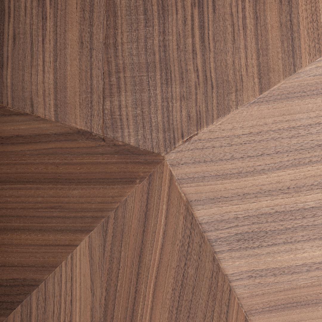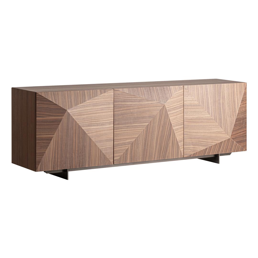 Буфет, изготовленный из орехового шпона коричневого цвета в сочетании с МДФ и нержавеющей сталью. Ширина: 220 см, Глубина: 45 см, Высота: 74 см