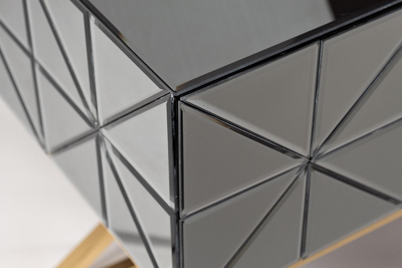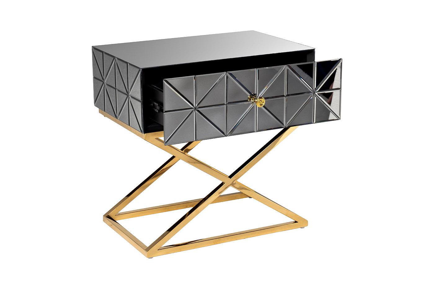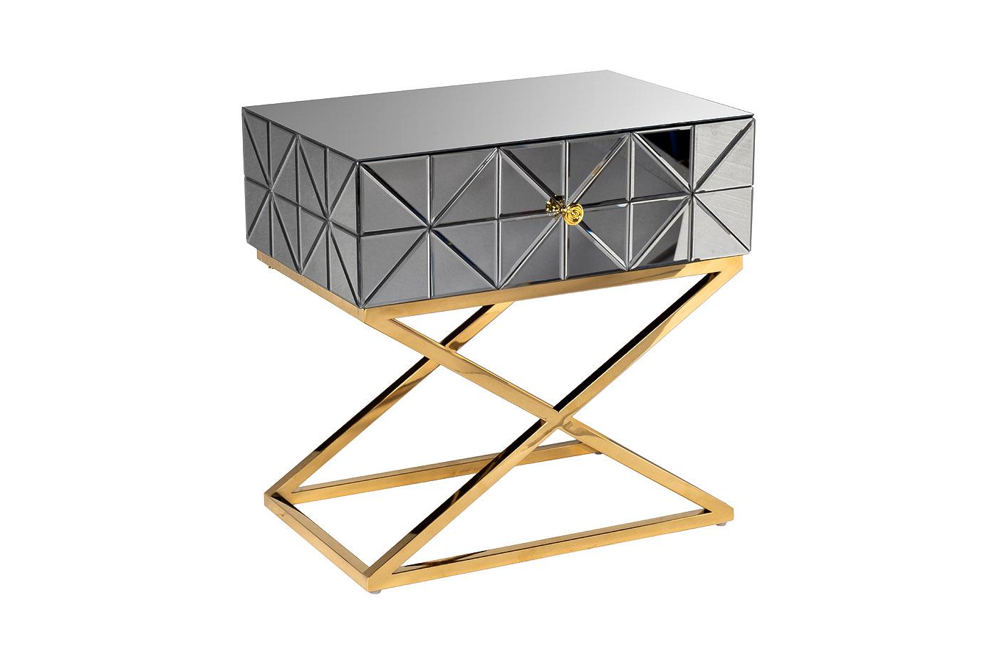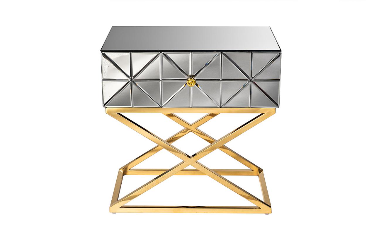 description-full - Неординарная тумбочка с выдвижным ящиком дополнит оригинальный интерьер спальни. Поверхность ее фасада собрана из небольших треугольных зеркал, что создает космическое впечатление. Мебель имеет основу из нержавеющей стали цвета золота. Скрещенные ножки гармонично дополняют дизайн зеркальной тумбочки, обеспечивая устойчивость. Представленная модель прекрасно подойдет для интерьера спальни в стиле неоклассики, арт-деко или фьюжн. Тумбочки компактны, поэтому даже в паре не займут много места. А вместительный ящик позволит хранить в нем все, что должно быть под рукой. Тумбу гармонично дополнят консоль арт. KFG113 и комод арт. KFG126 из этой же коллекции.