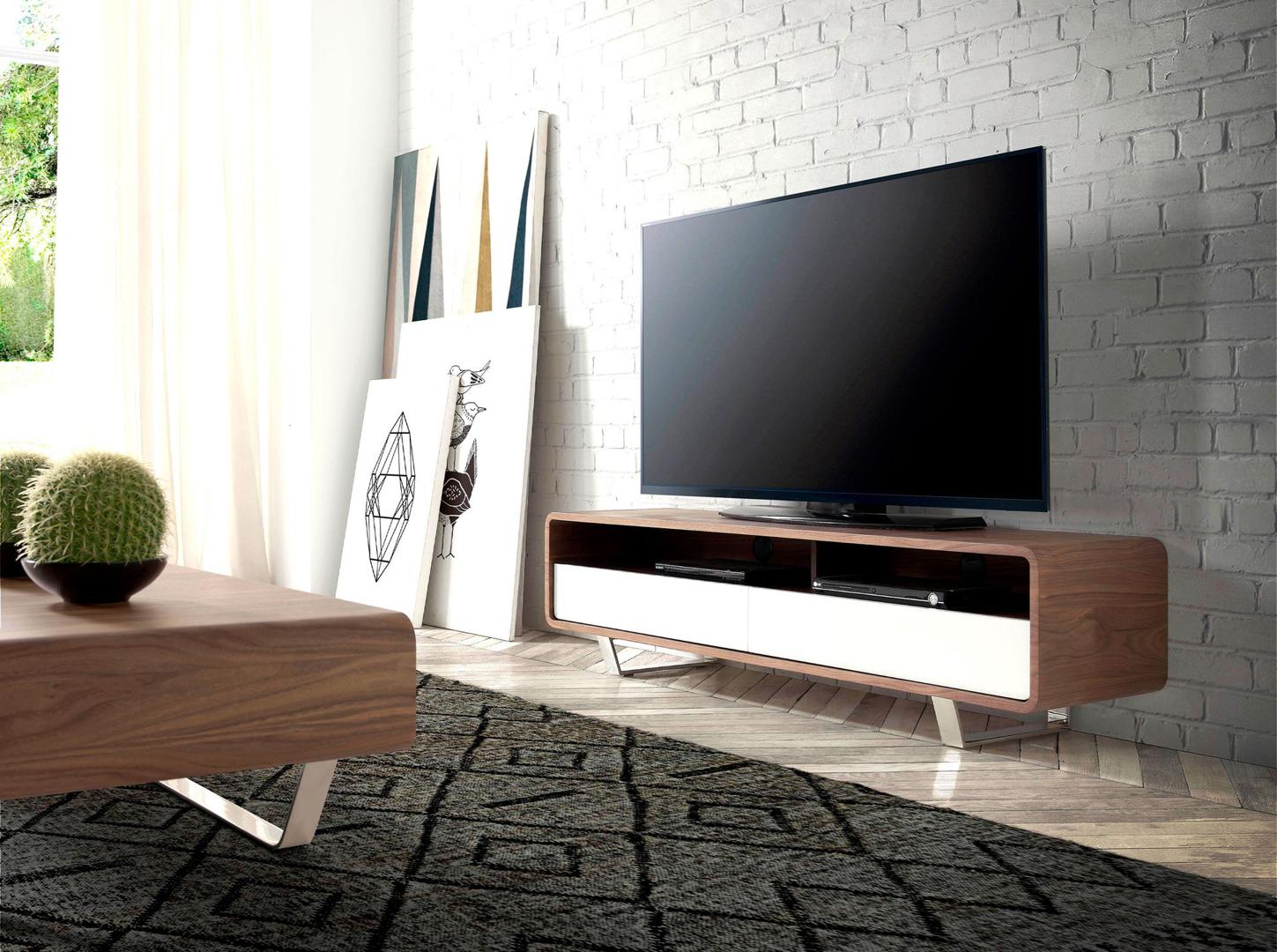 Тумба под ТВ 136-F фабрики Angel Cerda — дизайнерский предмет интерьера для современной гостиной. Тумба моментально останавливает на себе взгляд, так как здесь присутствует сразу несколько оригинальных дизайнерских решений. Закругленные углы каркаса, фасады выдвижных ящиков, выполненные в другом цвете, рамочные ножки с острыми углами — все эти яркие детали, которые делают данную модель интересной, оригинальной, нескучной. Тумба станет отличным приоритетным для тех, кто ищет лучшее в европейском модерне. Тумба имеет прямоугольную форму с округленными углами. Каркас выполнен из МДФ и орехового шпона с сохранением природного коричневого цвета и орнамента. Он разделен по горизонтали на две зоны, где верхняя представлена двумя открытыми полками, а нижняя состоит из двух выдвижных ящиков. Ящики сделаны из МДФ белого цвета, оснащены прочными направляющими из металла, доводчиками на открывание и закрывание. Ножки представляют собой рамочные конструкции, выполненные из хромированной стали. Их отличительная черта — форма перевернутой трапеции, благодаря чему тумба как бы выступает впереди. Прочный металл гарантирует стойкость к высоким весовым нагрузкам, а большая площадь соприкосновения с напольным покрытием обеспечит хорошую устойчивость. Габариты тумбы: длина — 150 см, высота — 40 см, глубина — 40 см. Вес — 48 кг. Тумба поставляется в разобранном виде, поэтому потребуется небольшая сборка Инструкция и крепеж входят в комплектацию. Отделка ящиков - лак RAL9003 Brillo.