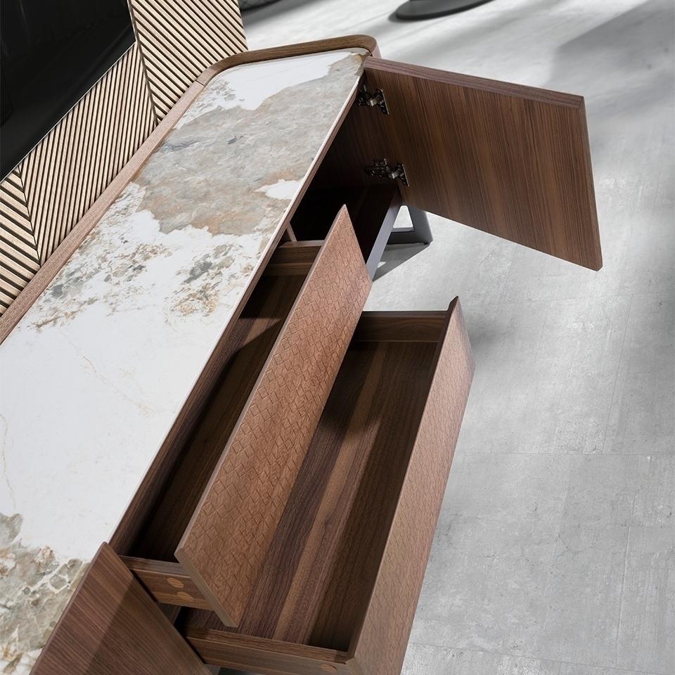 Тумба под ТВ 3250/437-F от фабрики Angel Cerda – отделка из американского ореха и керамическая столешница. Тумба под ТВ 3250/437-F – это современный дизайн с конструкцией из натурального шпона ореха и оригинальными ножками из нержавеющей стали темного цвета. Благодаря элегантной столешнице из белого керамогранита с серыми и коричневыми прожилками и глянцевой отделкой, вы получите изысканный вид, который ищете для своих комнат. Тумба под ТВ 3250/437-F состоит из прямоугольного каркаса с керамической столешницей и двух рамочных металлических ножек. Система хранения включает три секции. Слева и справа находятся отделения с распашными дверями, а в центре два выдвижных ящика. Нагрузка на ящик – не более 4 кг. Тумба имеет мягкую систему открытия, что современно и эргономично. Материал изготовления каркаса – древесина ясеня. Сверху ясень отделан шпоном ореха. Столешница покрыта плитой из керамики с мраморным орнаментом. Керамика – ударопрочный и износостойкий материал. Ножки окрашены гальванической краской в темно-серый цвет. Покрытие защищает изделие от коррозии и других негативных воздействий внешней среды. Для улучшения устойчивости на ножках есть накладки. Размеры: ширина – 200 см, высота – 52 см, глубина – 45 см. Вес составляет 85 кг. Потребуется минимальная сборка. Инструкция и крепеж включены в комплектацию. В коллекцию мебели Angel Cerda также включены буфет 3251/437-I и комод 3251/437-I с аналогичным дизайном.