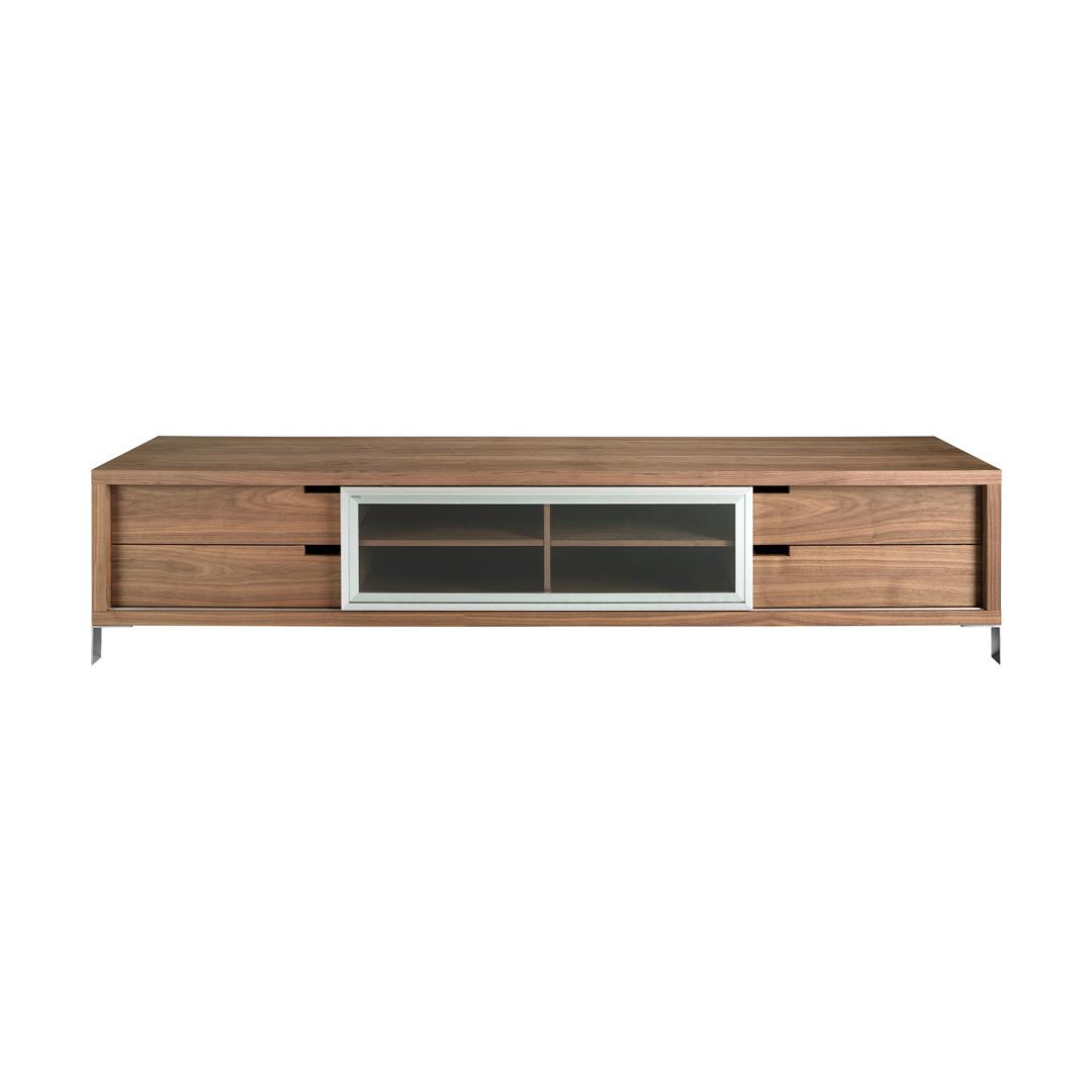 Тумба под ТВ Style орех от фабрики Angel Cerda — безупречное исполнение, верность современному стилю. Тумба Style — это дизайнерский предмет мебели с большой буквы. Натуральный цвет дерева, продуманная эргономика, стильное и небанальное исполнение. Такому изделию нужна центральная зона в гостиной и много места, ведь оно будет рассказывать о вашем вкусе и статусе без слов. Тумба выполнена из шпонированного МДФ, имеет форму вытянутого прямоугольника. Внутри каркаса — три секции, состоящие из выдвижных ящиков и полок. Слева и справа — выдвижные ящики с доводчиками. В центре — четыре полки, которые закрывает перегородка из матового стекла в металлической раме. Перегородка перемещается влево-вправо по принципу «купе». Поддерживают тумбу пять хромированных ножек — по одной с каждого угла и в самом центре основания каркаса. Благодаря прочности материала и симметричному расположению опор друг от друга, весовая нагрузка будет равномерно распределяться, тумба будет устойчива на любом напольном покрытии. Размеры изделия: длина — 238 см, высота — 51 см, глубина — 53 см. Вес составляет 79 кг. Ножки потребуется прикрутить самостоятельно. Инструкция и крепеж входят в комплектацию.