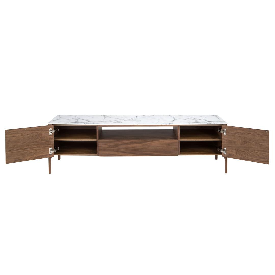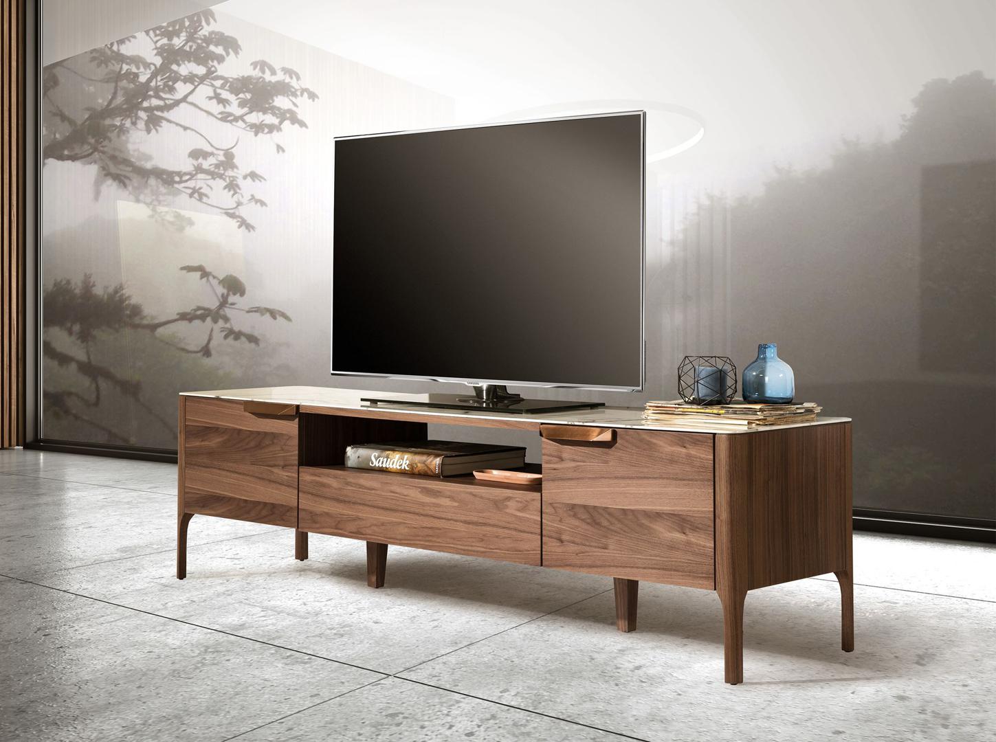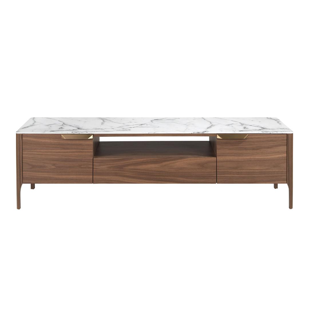 Тумба под ТВ CP1806-TV — оригинальное сочетание двух расцветок в одном изделии от дизайнеров фабрики Angel Cerda. Тумба моментально очаровывает и завораживает. В первую очередь, трудно оторвать взгляд от мраморной столешницы, которую совсем не ожидаешь увидеть у данного предмета мебели. Далее очаровывает естественный орнамент орехового дерева, который распространяется по всему периметру изделия. Вся эта красота, безусловно, гармонично впишется в современный интерьер, где ценят смелые дизайнерские идеи. Тумба прямоугольной формы, оснащена тремя ящиками и полкой. Левый и правый — одинаковые по своему исполнению. Они не выдвижные, оснащены дверцами с ручками и доводчиками. Центральный ящик выдвижной. Он также наделен доводчиками и прочными металлическими направляющими для долгой эксплуатации без поломок. Материал изготовления — МДФ и шпон орехового дерева. Эта порода обладает природной прочностью и удивительной красоты орнаментом. Кроме того, ее теплый коричневый цвет удачно гармонирует с различными интерьерами. Сверху — матовое закаленное стекло с имитацией под мрамор. Тумба стоит на шести ножках, что обеспечивает равномерное распределение нагрузки. Размеры изделия: длина — 180 см, высота — 50 см, глубина — 45 см. В коллекции CP1806 представлены аналогичные прикроватные тумбочки, письменный стол, комод.