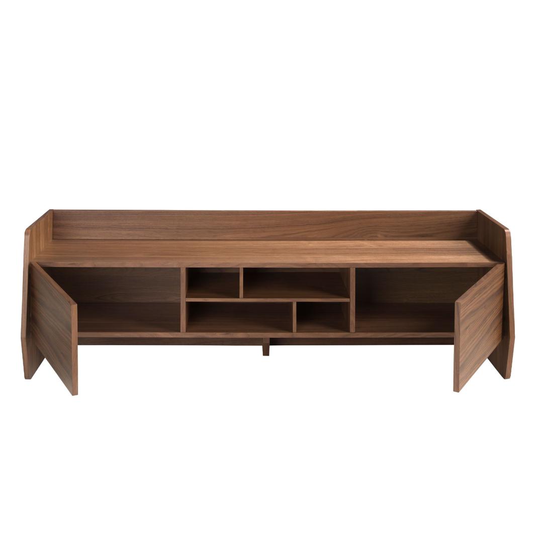 Современная тумба под телевизор с каркасом из натурального орехового шпона и оригинальными ножками из натурального орехового шпона. В нем имеется большое отделение для хранения вещей с двумя дверцами с системой открывания с помощью пальцев и доводчиками.