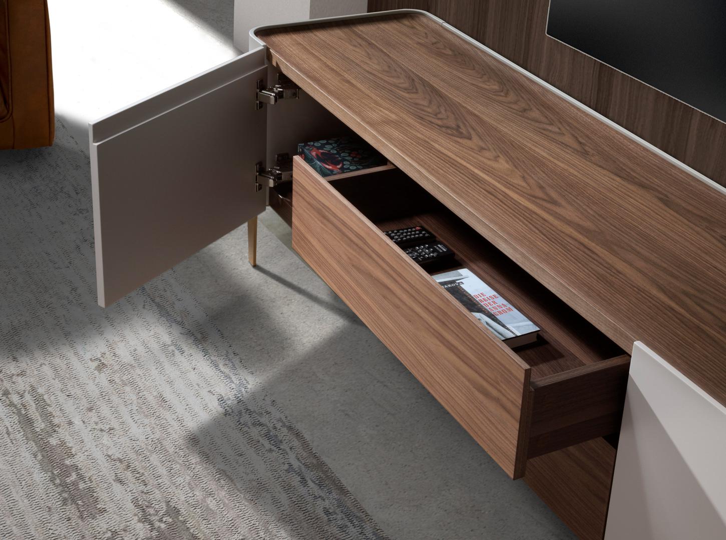 Современная тумба под телевизор с натуральной структурой из орехового шпона и бежевым лакированным МДФ, а также оригинальные полированные ножки из нержавеющей стали золотистого цвета. Благодаря элегантной столешнице из натурального орехового шпона вы получите изысканный вид, который ищете в своих комнатах. Ее оригинальные детали из полированной нержавеющей стали золотистого цвета добавят идеальный штрих стиля в вашу гостиную. Она имеет достаточно места для хранения с 2 ящиками с ручным открыванием с помощью выемки для пальцев и системой плавного закрывания, а также 2 дверцы с ручным открыванием с помощью выемки для пальцев и системой плавного закрывания.
