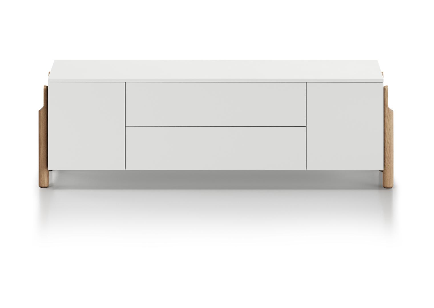 Тумба Basic 2 двери 2 ящика ширина 170 см Высота: 54 см Ширина: 170 см Глубина: 42 см Вес: 75 кг Материал: МДФ Каркас ящиков: ЛДСП Покрытие корпуса: МДФ под эмалью RAL 9003 Ножки: дуб