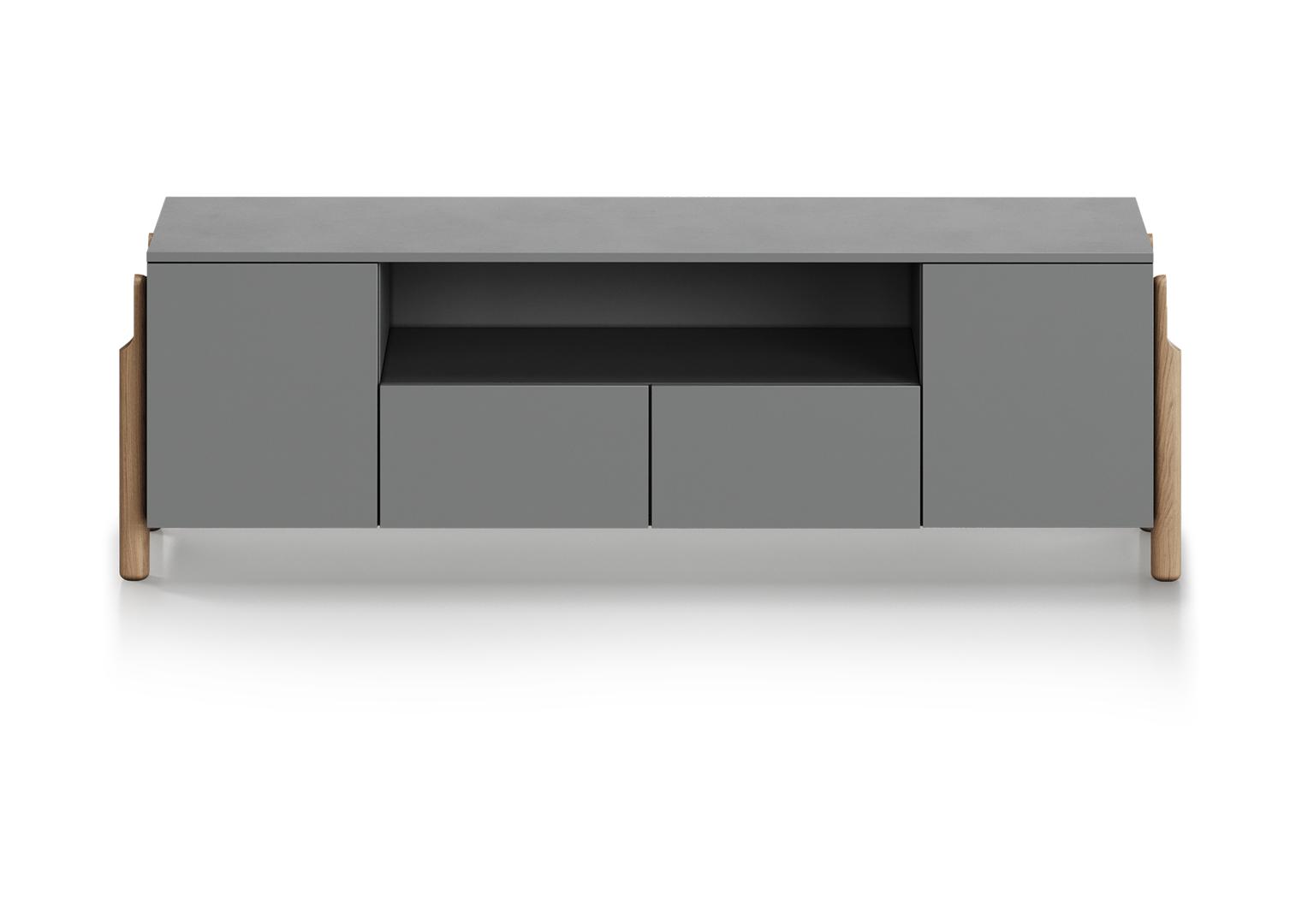 Тумба Basic под ТВ с нишей ширина 170 см Высота: 54 см Ширина: 170 см Глубина: 42 см Вес: 75 кг Материал: МДФ Каркас ящиков: ЛДСП Покрытие корпуса: RAL 7037 Ножки: дуб