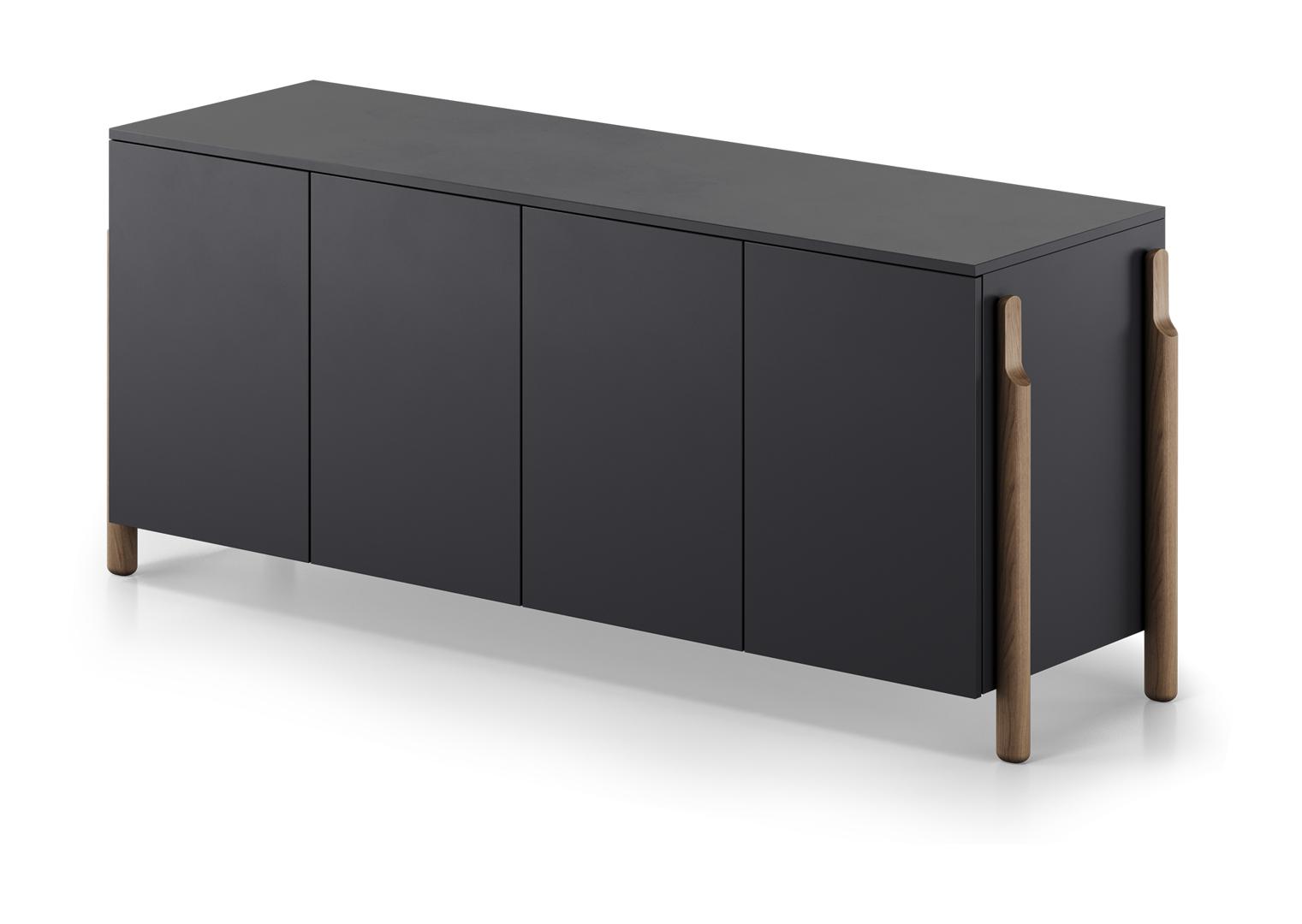 Тумба Basic 4 двери ширина 170 см Высота: 70 см Ширина: 170 см Глубина: 49 см Вес: 80 кг Материал: МДФ Каркас ящиков: ЛДСП Покрытие корпуса: эмаль RAL 9005 Ножки: дуб