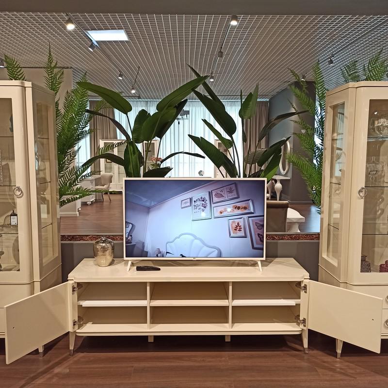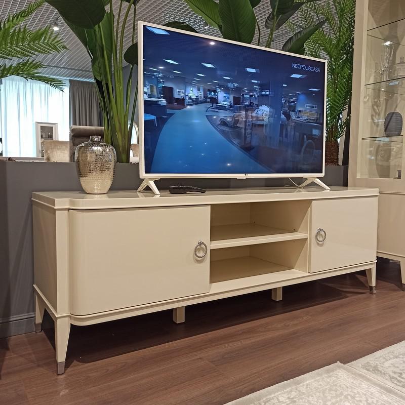Изящная тумба под ТВ Modena от итальянского бренда Fratelli Barri. Тумба в неоклассическом стиле, с 3-мя отделениями. По центру открытое отделение с полкой, по бокам отделения за дверкой, также с полкой. Закругленные фасады. Отделка - бежевый глянцевый лак. На ножках металлические колпачки. Выполнен из массива дерева и высококачественного МДФ класса Е1. Цвет фурнитуры - хром. Внутренние полки - белого цвета.