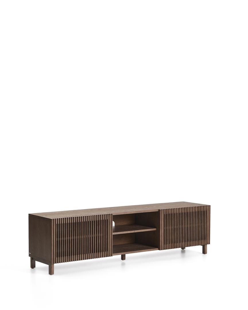 Тумба под телевизор из коллекции Beyla сочетает в себе изысканность ясеня и тщательно продуманный дизайн. Каркас выполнен из ясеневого шпона, а дверца и ножки – из массива дерева с элегантной отделкой под орех. Распашные дверцы украшены вертикальными планками, которые создают визуальный ритм и позволяют свету создавать тонкие контрасты на поверхности.