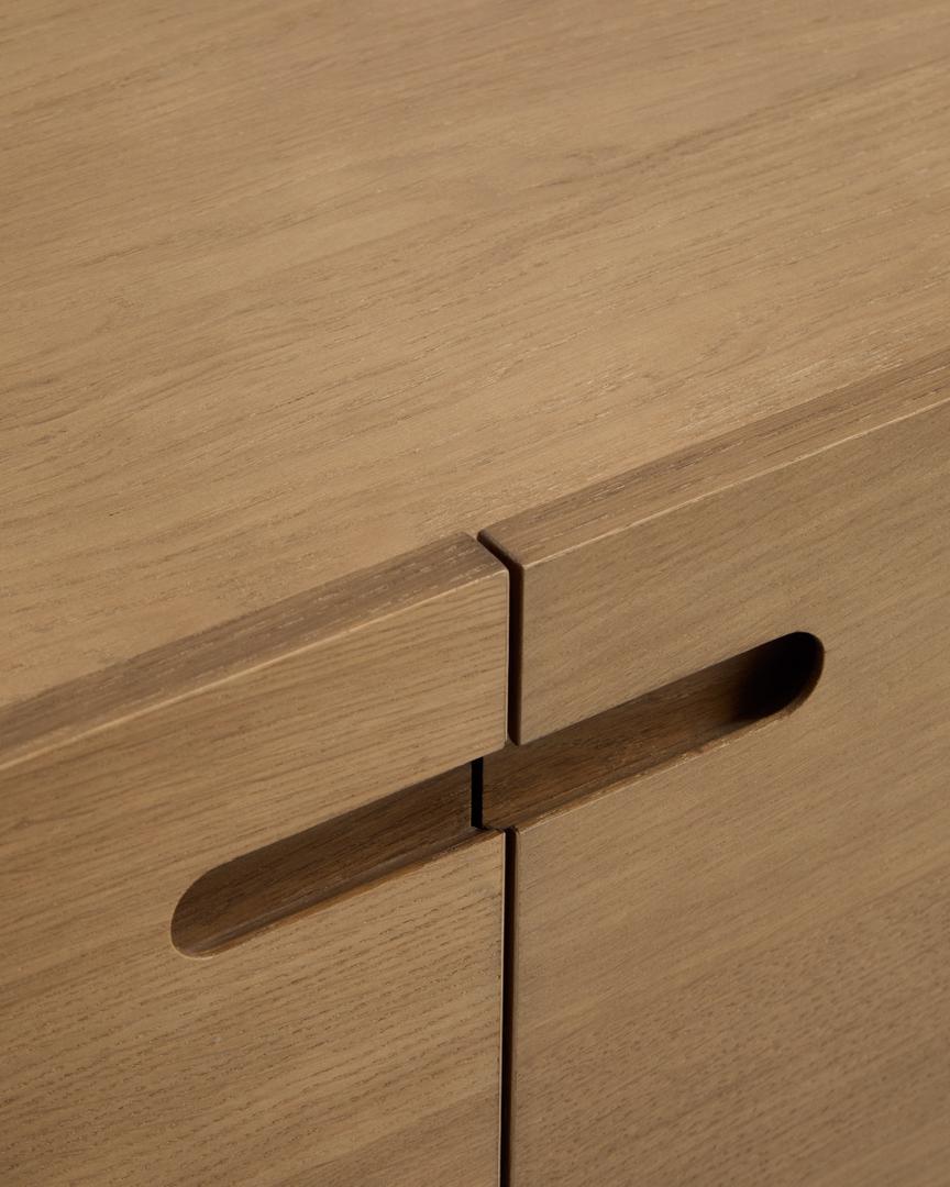 Коллекция Arelida изготовлена из дубового шпона и массива дуба с коричневой отделкой, которая подчеркивает текстуру и рисунок древесины, придавая каждому изделию теплоту и сбалансированный вид. Плавные линии и закругленные края определяют изысканный дизайн, приятный на ощупь. Она оснащена системой плавного закрывания и регулировочными элементами на основании для выравнивания неровностей пола. Локальное производство в Европе и ручная работа способствуют снижению выбросов CO₂ и обеспечивают более экологичное производство.