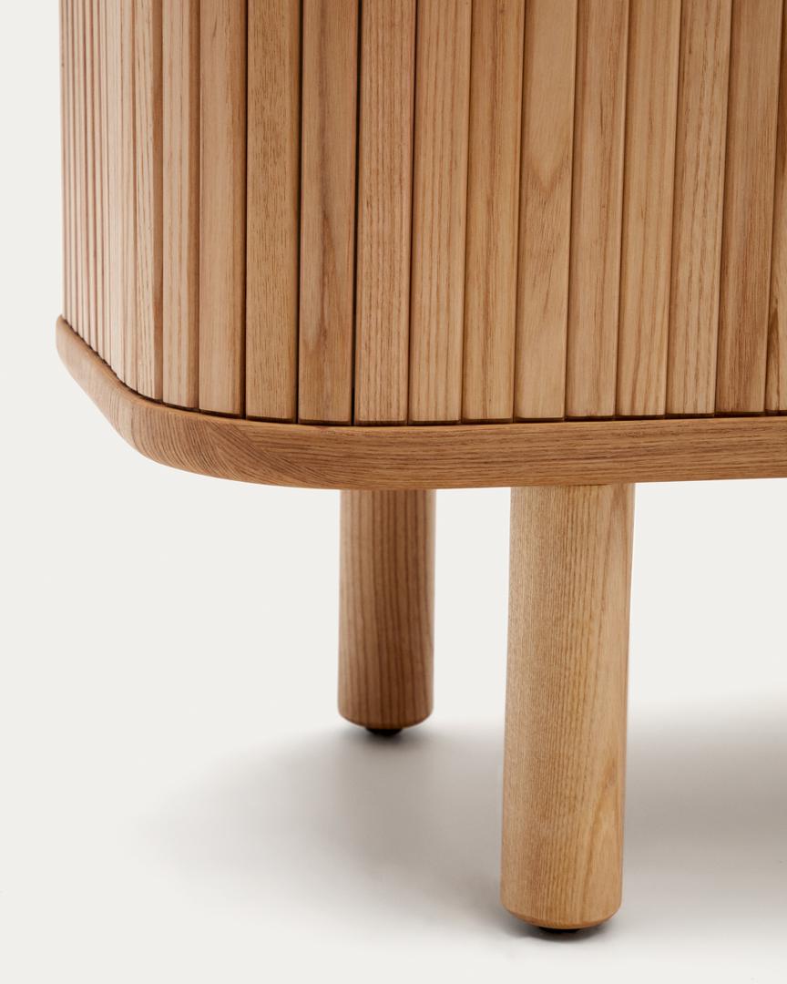 Команда Kave Home создала коллекцию Mailen современного дизайна с закругленными формами, выполненную из ясеневого шпона и раздвижными дверями с деревянными рейками, которые делают ее настоящим героем.