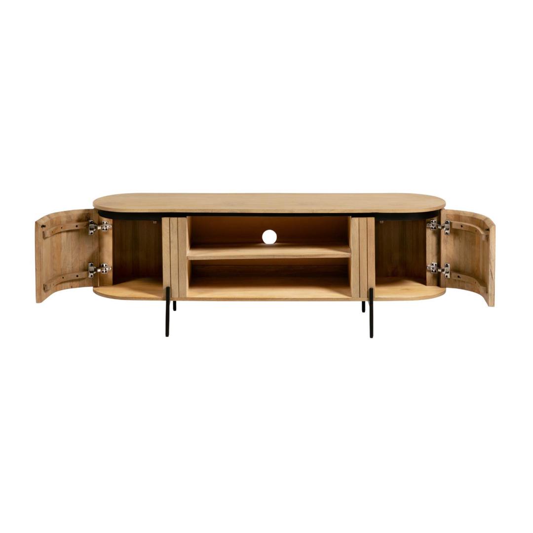 Тумба под ТВ Lucia от фабрики La Forma – необычная конструкция, ценная порода дерева. Тумба под ТВ Lucia – это яркий и впечатляющий предмет интерьера. Дощатая структура, натуральным массив и изогнутые двери – все это уникальные особенности модели. Тумба привнесет в городской интерьер не просто тепло и уют вместе с массивом, но и создаст особый колорит «южной» мебели, с эмоциональным темпераментом. Тумба имеет овальную форму, оснащена двумя ящиками и одной полкой. Она полностью сделана из дерева манго, которое отличается прочностью и долговечностью. Для защиты от негативных внешних воздействий массив покрыт специальной пропиткой. Сзади полки есть отверстие для вывода ТВ кабеля диаметром 6,5 см. Двери имеют дуговую форму и дощатую конструкцию. Они открываются наружу, слева-направо. Внутри каждого отделения предусмотрено по одной полке. Удерживают тумбу две металлические стойки черного цвета с порошковым покрытием. Ножки высотой 12 см имеют войлочные наконечники для защиты напольного покрытия от повреждений и регулировки высоты. Размеры изделия: длина – 160 см, глубина – 43 см, высота – 56 см. Вес – 40 кг. Потребуется сборка, которая займет 10 минут. В коллекции Lucia также есть комод с аналогичным дизайном.