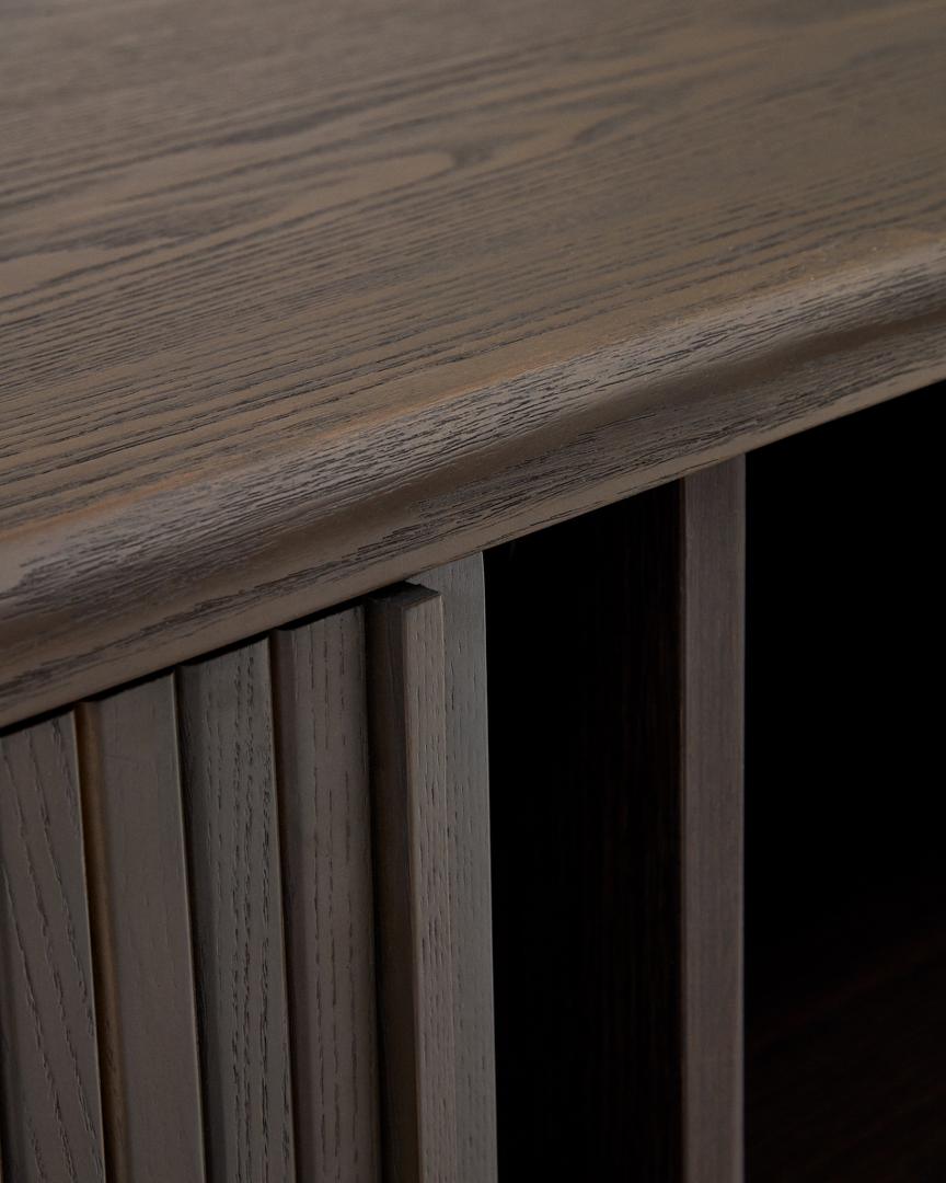Команда Kave Home создала коллекцию Mailen современного дизайна с закругленными формами, выполненную из ясеневого шпона и раздвижными дверями с деревянными рейками, которые делают ее настоящим героем.