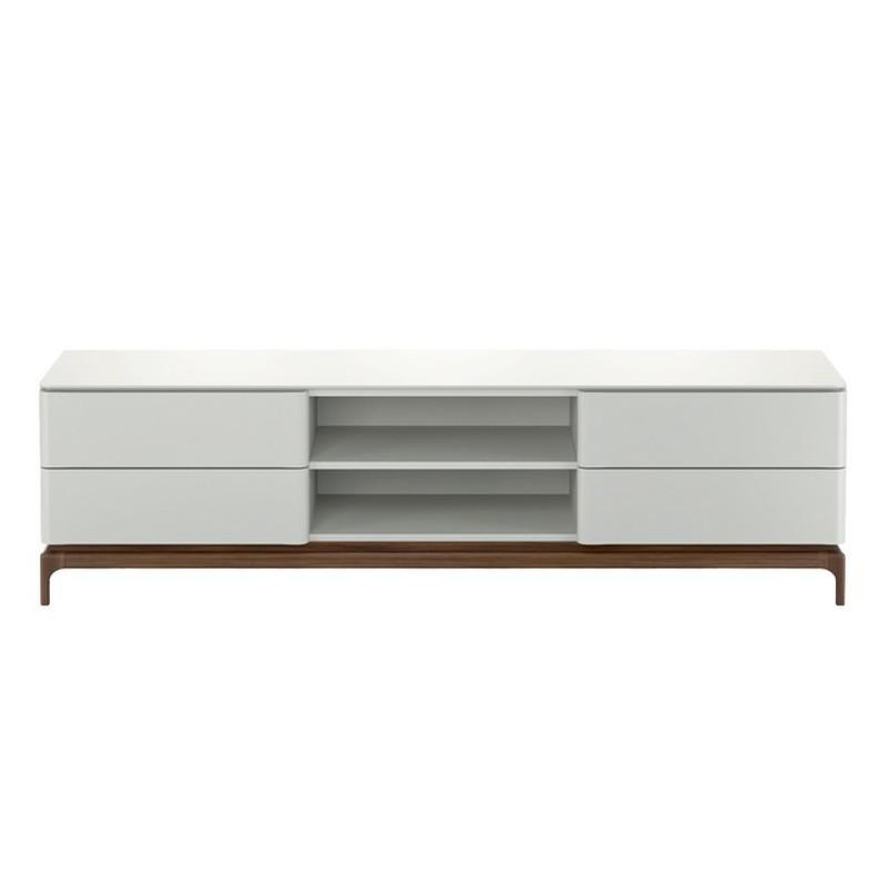 Тумба под TV от бренда Mod Interiors в современном стиле. Тонкая столешница, округлые высокие ножки и контрастные цвета - все это делает данную модель ярким элементом интерьера. Корпус и столешница выполнены из высококачественного МДФ высокой прочности в отделке матовый лак светло-серого оттенка. База из массива дерева в натуральном шпоне ореха. У тумбы 4 ящика со скрытыми направляющими и системой открывания push to open (открывание нажатием). В нижней нише есть круглое отверстие для проводов.