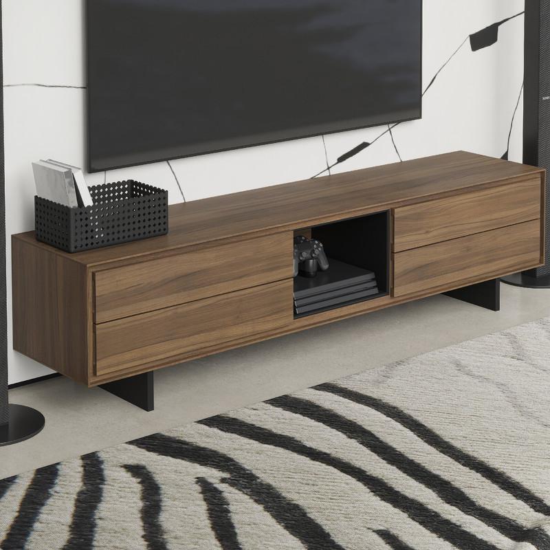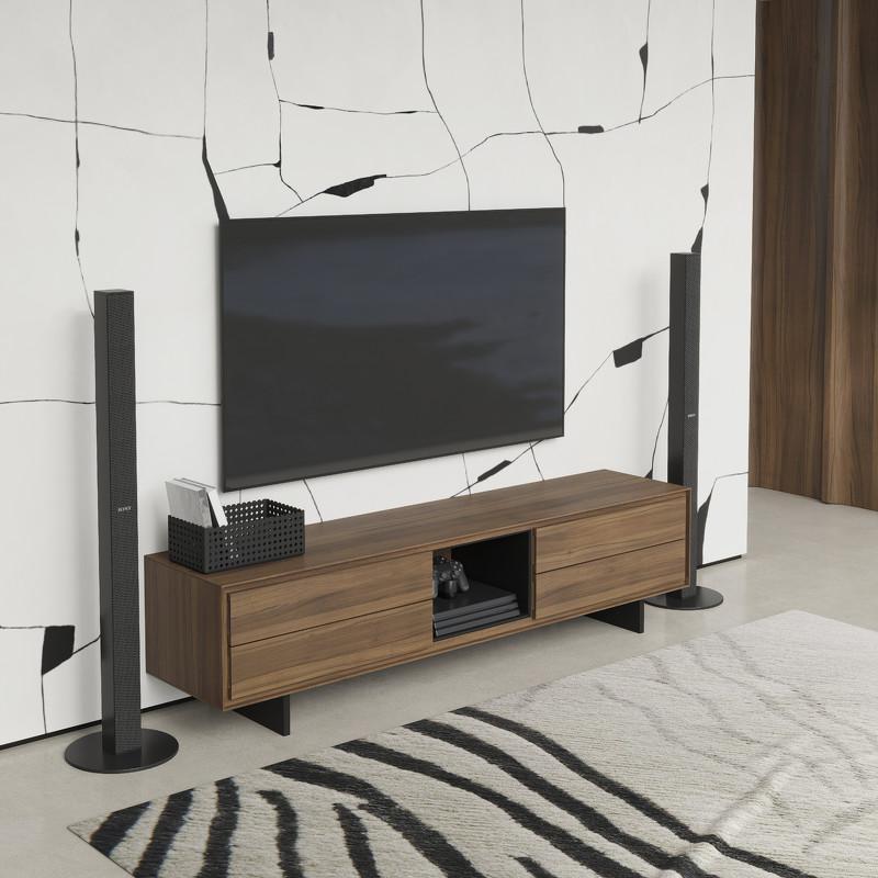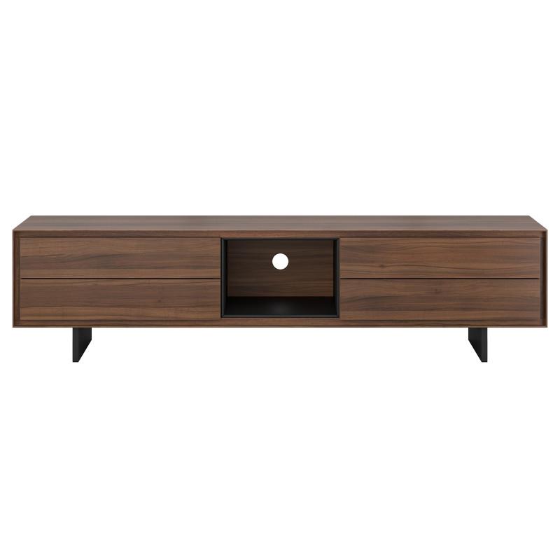 ТВ тумба Miramar в современном стиле на высоких ножках. Рисунок натурального шпона всегда индивидуален, что делает эту модель неповторимой. На фасадах сделан подбор рисунка шпона, что значительно повышает уровень продукта. ТВ тумба выполнена из высококачественного, сертифицированного МДФ высокой плотности. Отделка - натуральный шпон северо-американского ореха. Ножки и вставка в открытой полке выполнены из метала и окрашены в черный матовый цвет. ТВ тумба оснащена 4-мя выдвижными ящиками с механизмом открывания push pull (открывание нажатием). В большой открытой нише на задней стенке есть отверстие для проводов. Размер открытой полки: Высота 23,5 глубина 33,5 ширина 37,2