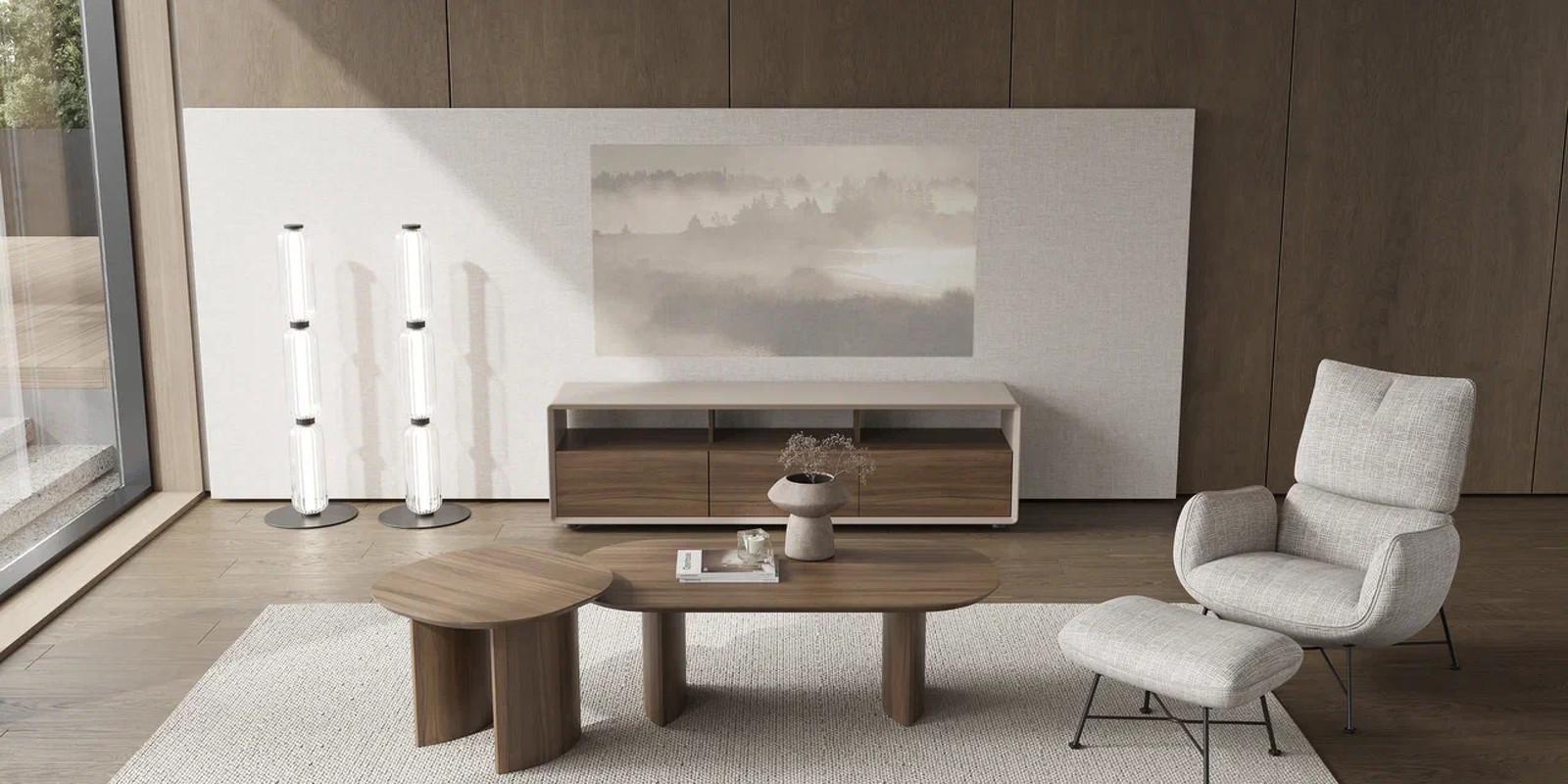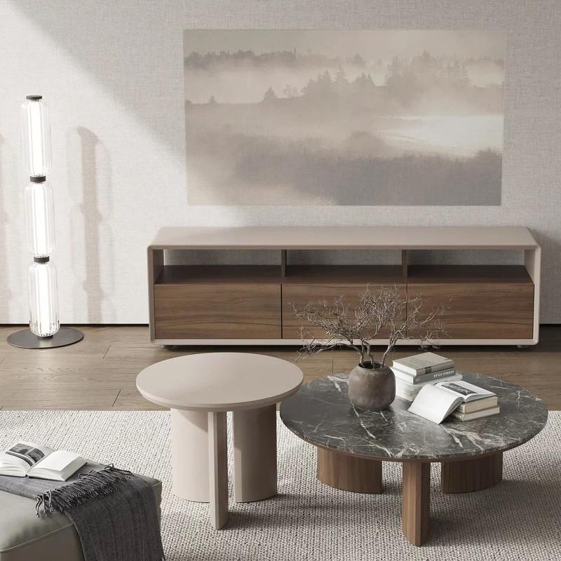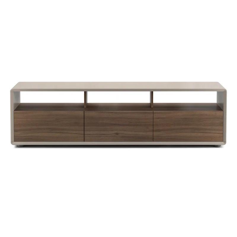 Тумба под ТВ Olimar от бренда MOD Interiors в современном стиле. Открытая ниша позволяет сделать этот предмет мебели максимально удобным в использовании. Контрастная отделка делает тумбу под ТВ очень акцентной в интерьере. Корпус и фасады выполнены из высококачественного МДФ класса Е1. Угловые элементы корпуса - массив дерева. Отделка - натуральный шпон американского ореха и матовый лак светло-бежевого цвета. ТВ тумба с тремя выдвижными ящиками, что делает его максимально удобным в использовании. Ящики со скрытыми направляющими и современной системой легкого открывания push-to-open (открывание нажатием). Буфет стоит на пяти пластиковых ножках черного цвета. Они углублены и практически незаметны. Высота ниши 16.5 см.