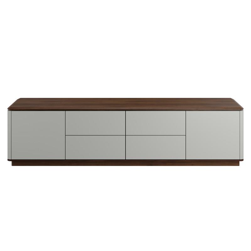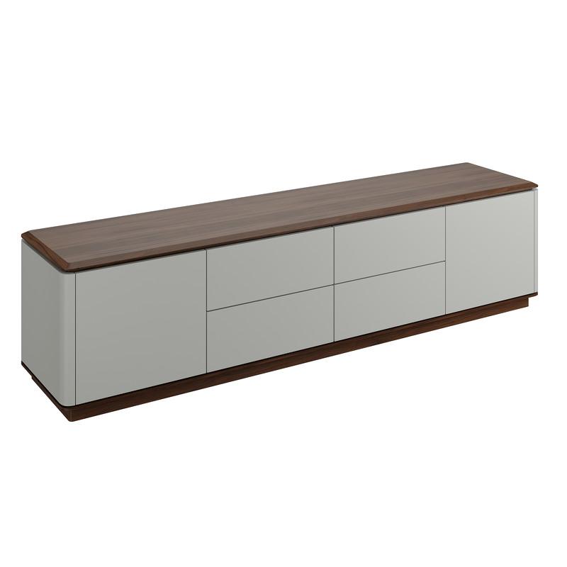 Большая и вместительная тумба под TV из коллекции Altea от бренда MOD Interiors в современном стиле. Тумба оснащена четырьмя ящиками и двумя дверцами, за которыми находятся еще по две полки в каждой секции. Тумба выполнена из высококачественного МДФ высокой прочности. Отделка корпуса и фасадов - матовый лак приятного светло-серого оттенка. Отделка столешницы и базы - натуральный шпон ореха. Ящики дополнены системой легкого открывания push-to-open (открывание нажатием без ручки). Фасады гладкие, без узора.