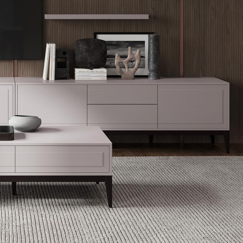 Тумба под TV на высоких ножках из коллекции Marbella от испанского бренда MOD Interiors. Дизайнерская фрезеровка модели выглядит лаконично и стильно. Модель имеет два ящика и две дверцы. Отделка — приятный серый матовый оттенок. Фасады — 100% шпон ореха на высококачественной МДФ высокой плотности. Ножки из массива березы — темно-коричневая (почти черная) древесина с натуральным рельефом. Внутри ящики оснащены системой легкого открывания push-to-open.