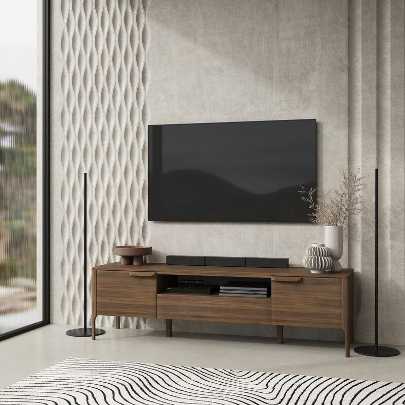 Тумба под ТВ от испанского бренда MOD Interiors прекрасно впишется в интерьер гостиной в современном стиле. Корпус тумбы изготовлен из высококачественного МДФ высокой плотности. Ножки и ручки выполнены из массива дерева. Внутренняя поверхность тумбы и ящиков -меламин. Отделка - натуральный шпон американского ореха. Тумба оснащена двумя дверками и 1 выдвижным ящиком. Ящик снабжен системой плавного закрывания Soft closing. Для большей устойчивости тумба оснащена двумя дополнительными ножками в углублении. От пола до открытой полки 34 см; Высота открытой полки 14 см, глубина 14 см; Длинна открытой полки 80 см. Глубина выдвижного ящика 6.5 см. От пола до проема 34 см.