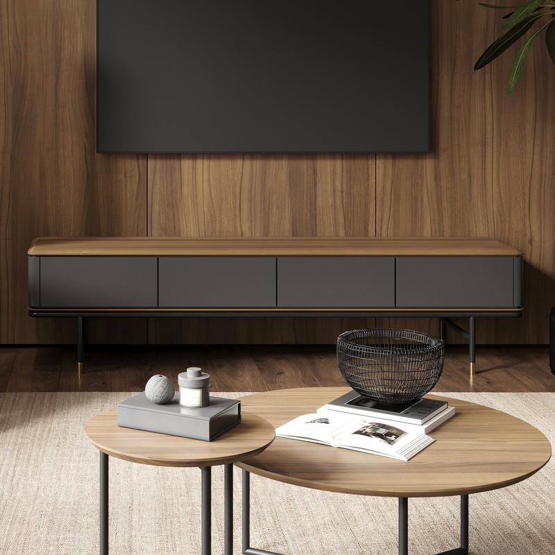 Тумба под TV с четырьмя ящиками из коллекции Altea от бренда MOD Interiors. Вся мебель Altea оформлена в современном стиле с ярким влиянием ретро 60-х (mid-century modern). Силуэтный дизайн на высоких черных ножках с латунными колпачками. Матовые грифельно-серые фасады красиво рассеивают естественный и искусственный свет. Выполнена из высококачественной сертифицированной МДФ высокой плотности. Обратите внимание на нестандартно большую длину — 200 см. Модель тумбы имеет деревянную столешницу из натурального шпона ореха со скругленными углами, что предотвращает травмирование взрослых и детей. Четыре ящика дополнены современной системой легкого открывания push-to-open.