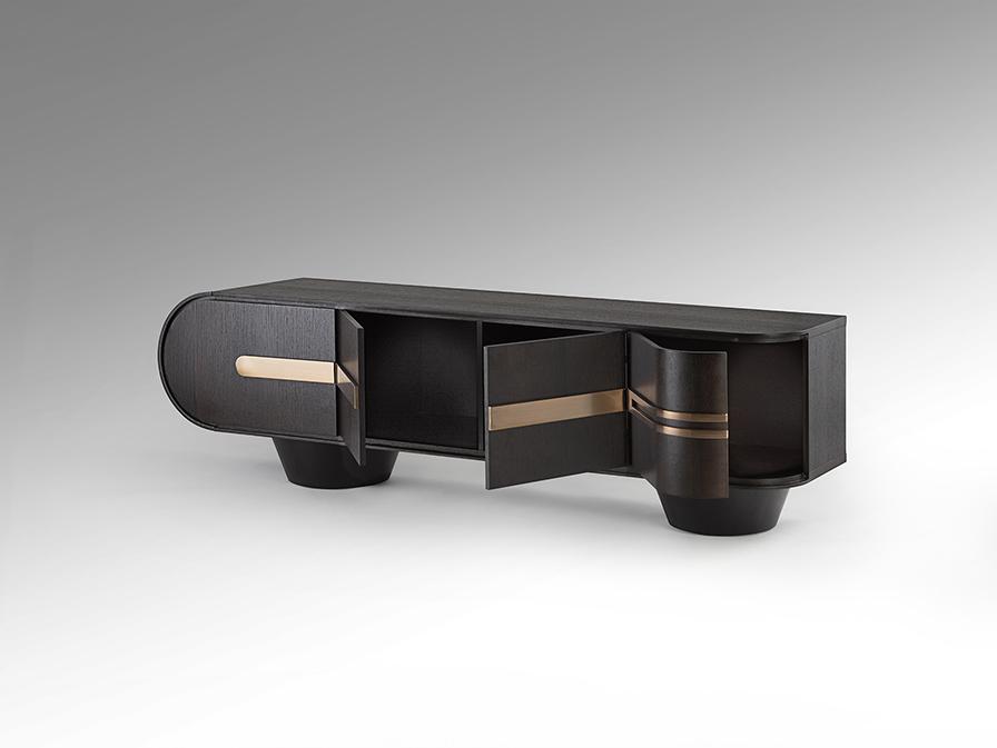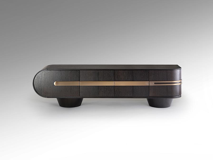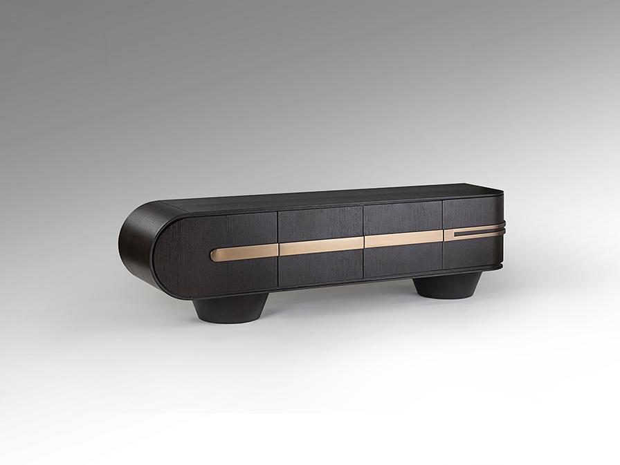 4-дверная тумба под телевизор изготовлена из МДФ цвета темного дуба, с фурнитурой и металлическими деталями из нержавеющей стали с покрытием розового золота.
