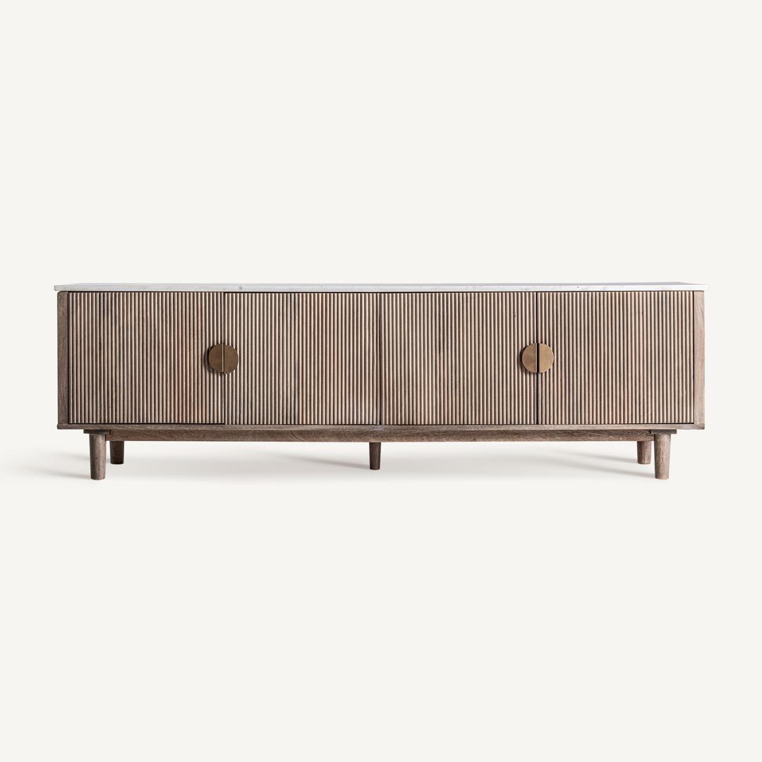Подставка под телевизор Zerf от VICAL сочетает в себе теплоту мангового дерева и элегантность белого мрамора. Её линейный дизайн и каркас из МДФ обеспечивают визуальный баланс и функциональность. Эта модель преобразит гостиную, придав ей сдержанность и индивидуальность.