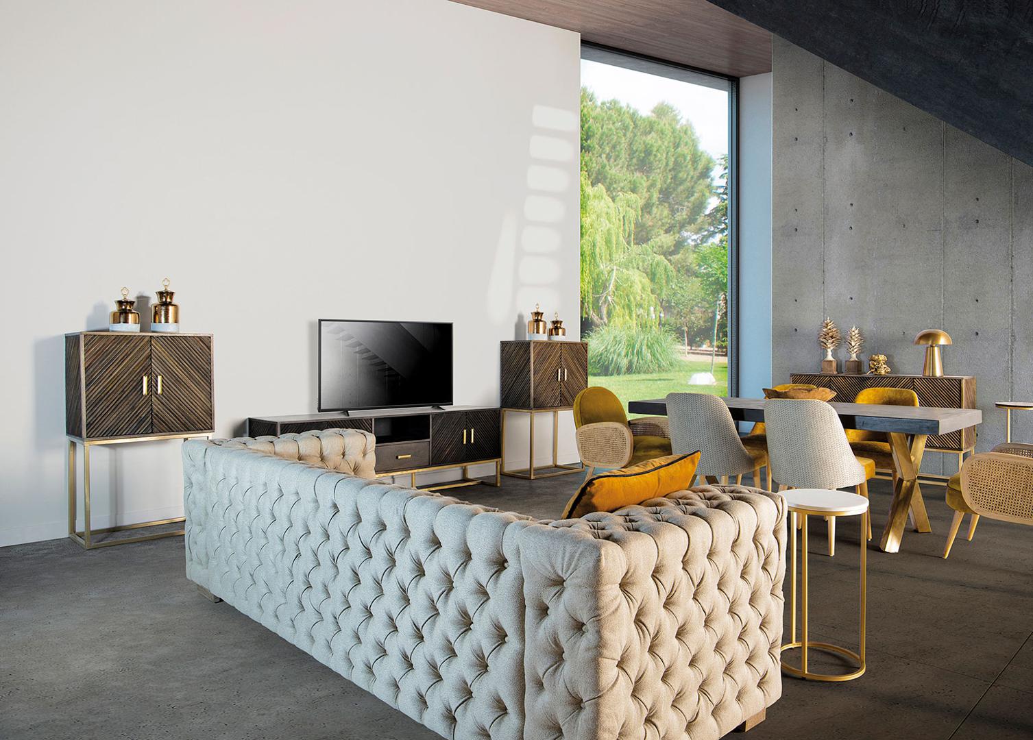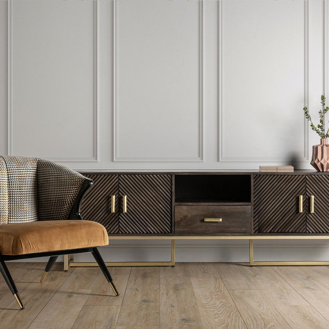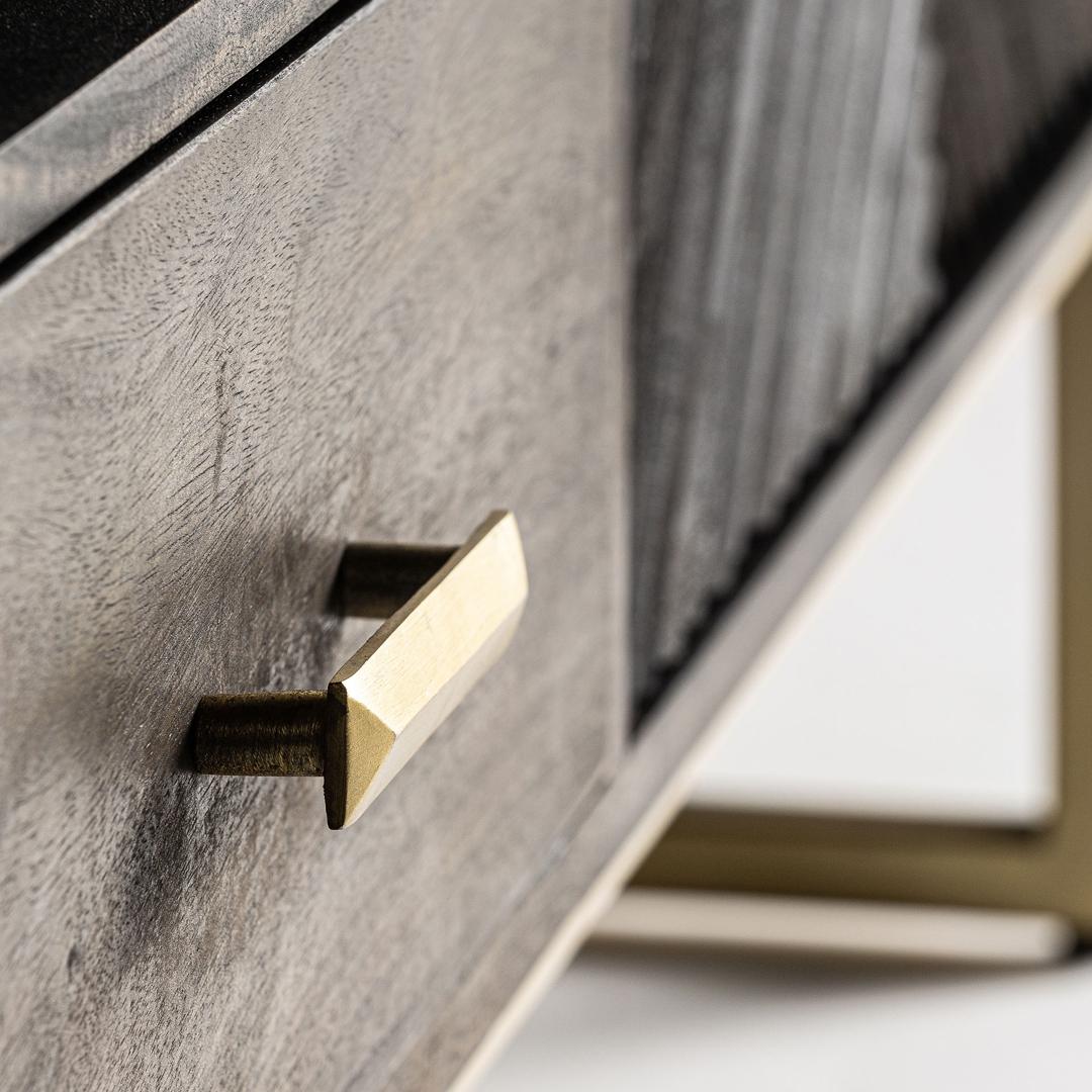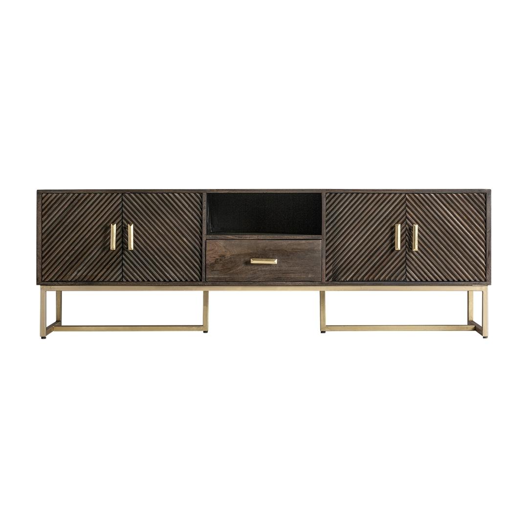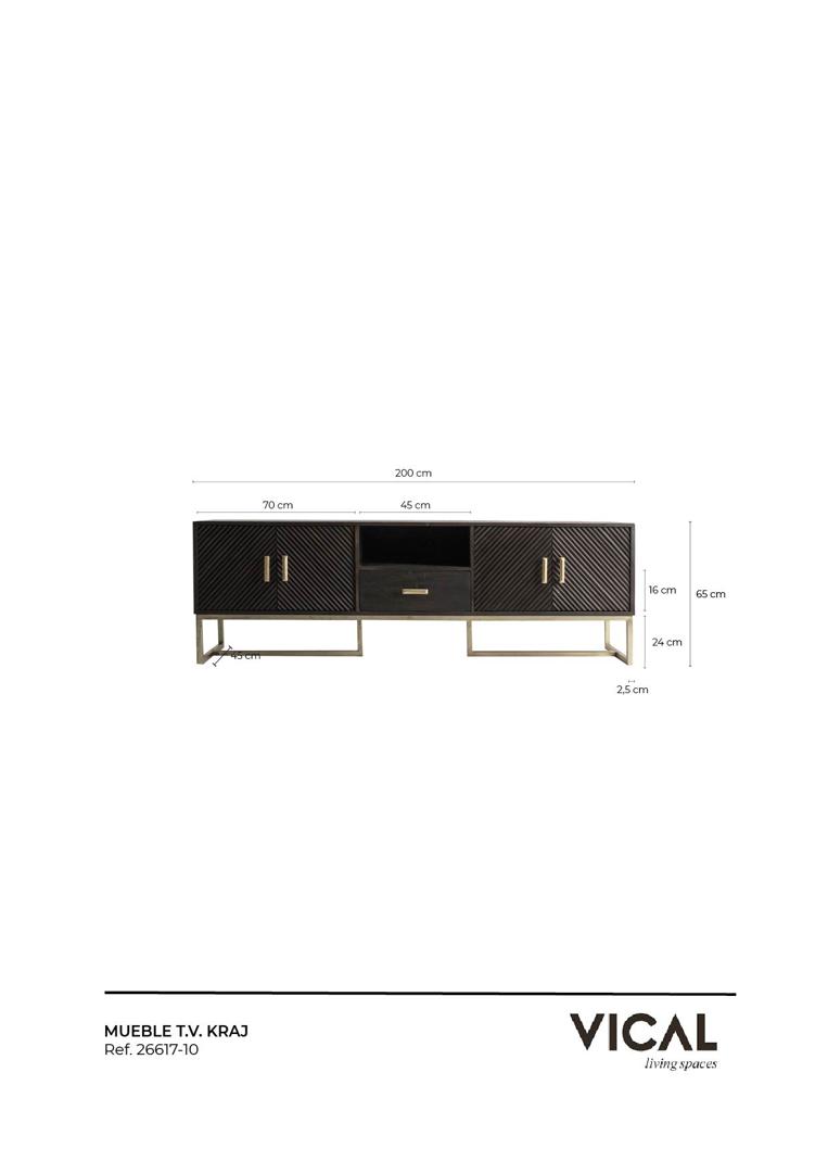 Тумба под телевизор KRAJ от VICAL home — это идеальное сочетание элегантности и функциональности. Этот несъемный предмет мебели размером 200x45x66 см, изготовленный из железа с деталями из дерева манго, предлагает впечатляющий контраст коричневого и золотого цветов, превращая вашу гостиную в эпицентр стиля.