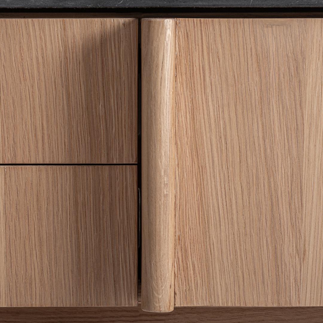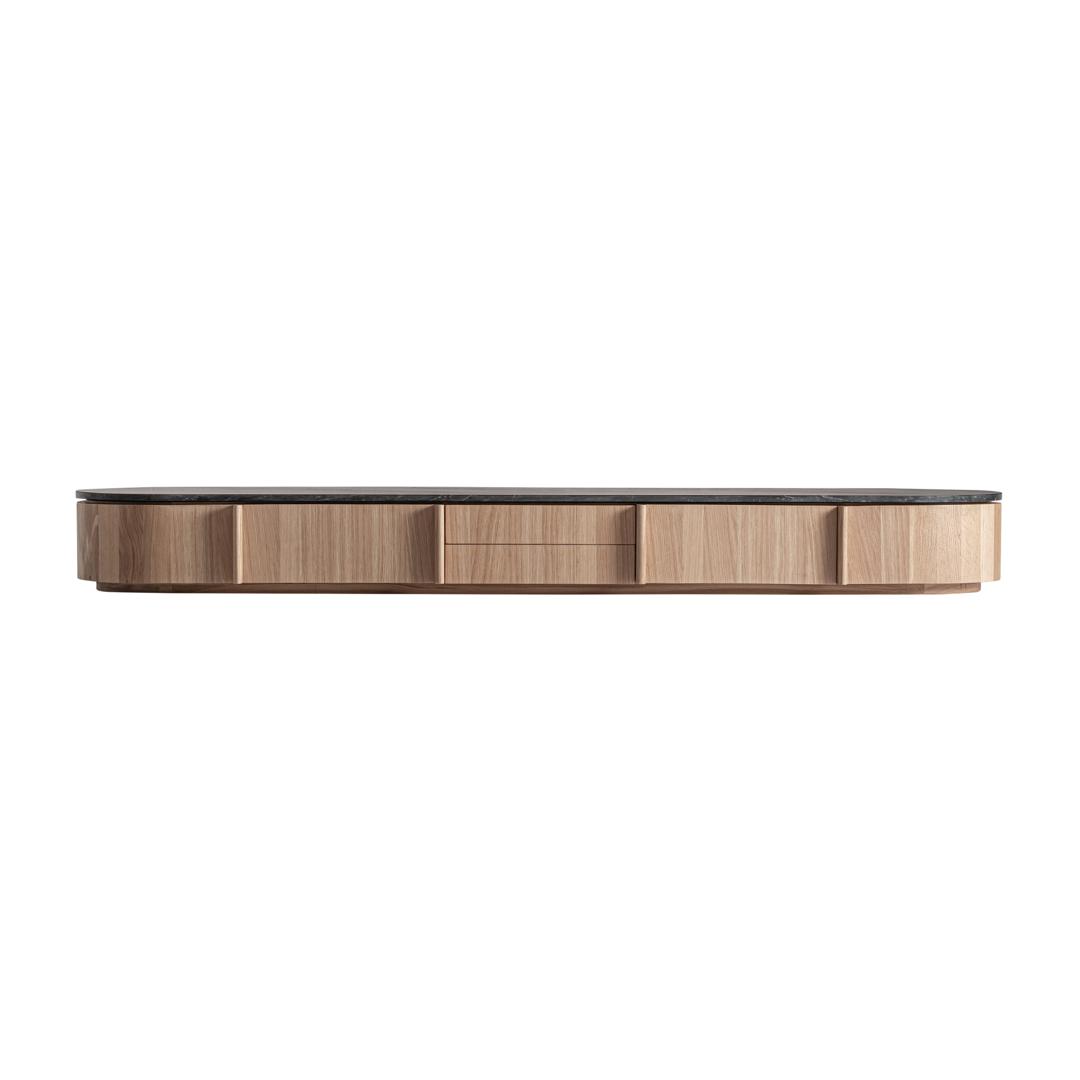Тумба под телевизор Nara в современном стиле, изготовленная из светло-коричневого дуба в сочетании с черным мрамором. Ширина: 240 см, Глубина: 62 см, Высота: 25 см