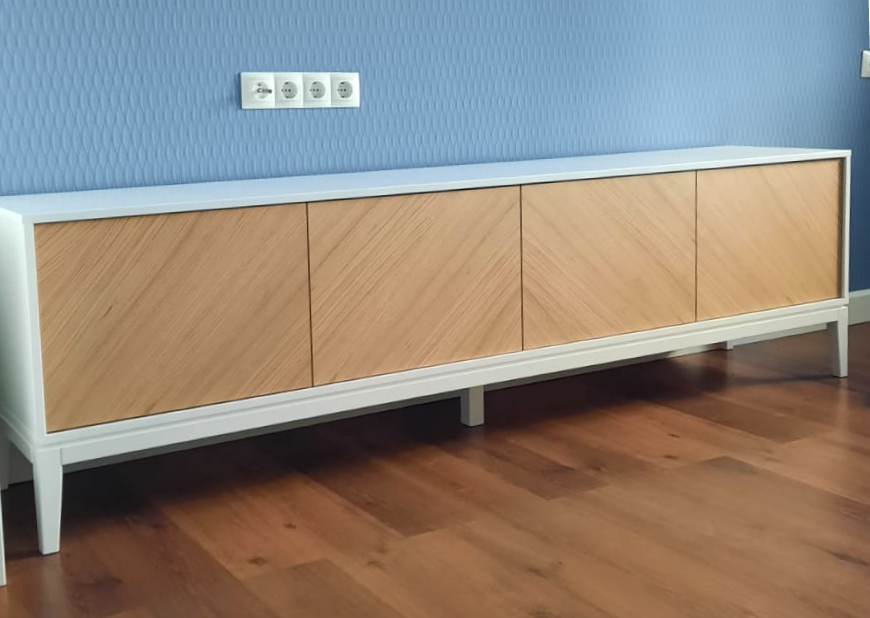 Тумба Fjord 4 двери напольная Высота: 58,8 см Ширина: 206,4 см Глубина: 40,5 см Каркас: массива бука Корпус: МДФ под эмалью Фасады: тонированный шпон дуба Система Push-to-Open позволяет открывать распашные дверцы простым нажатием на фасад. То есть, при небольшом надавливании на дверцу, она плавно приоткроется.