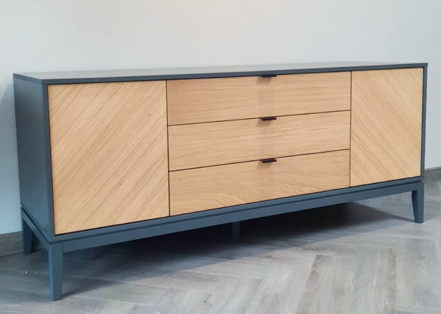 Тумба Fjord 2 двери 3 ящика Высота: 70 см Ширина: 162 см Глубина: 51 см Основание: массива бука Корпус: МДФ под эмалью Фасады: шпон дуба Ящики на бесшумных направляющих с доводчиками