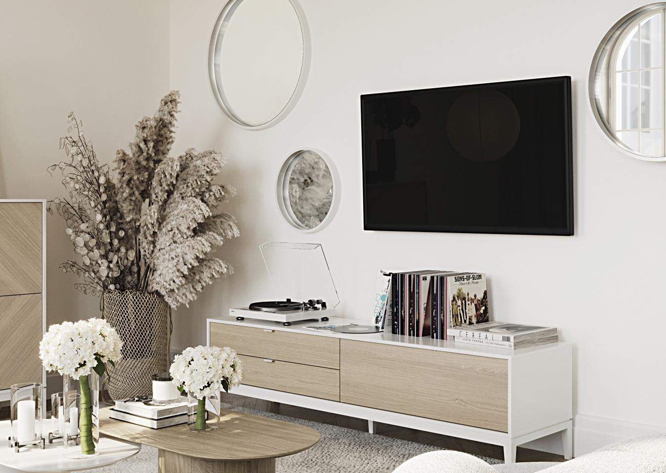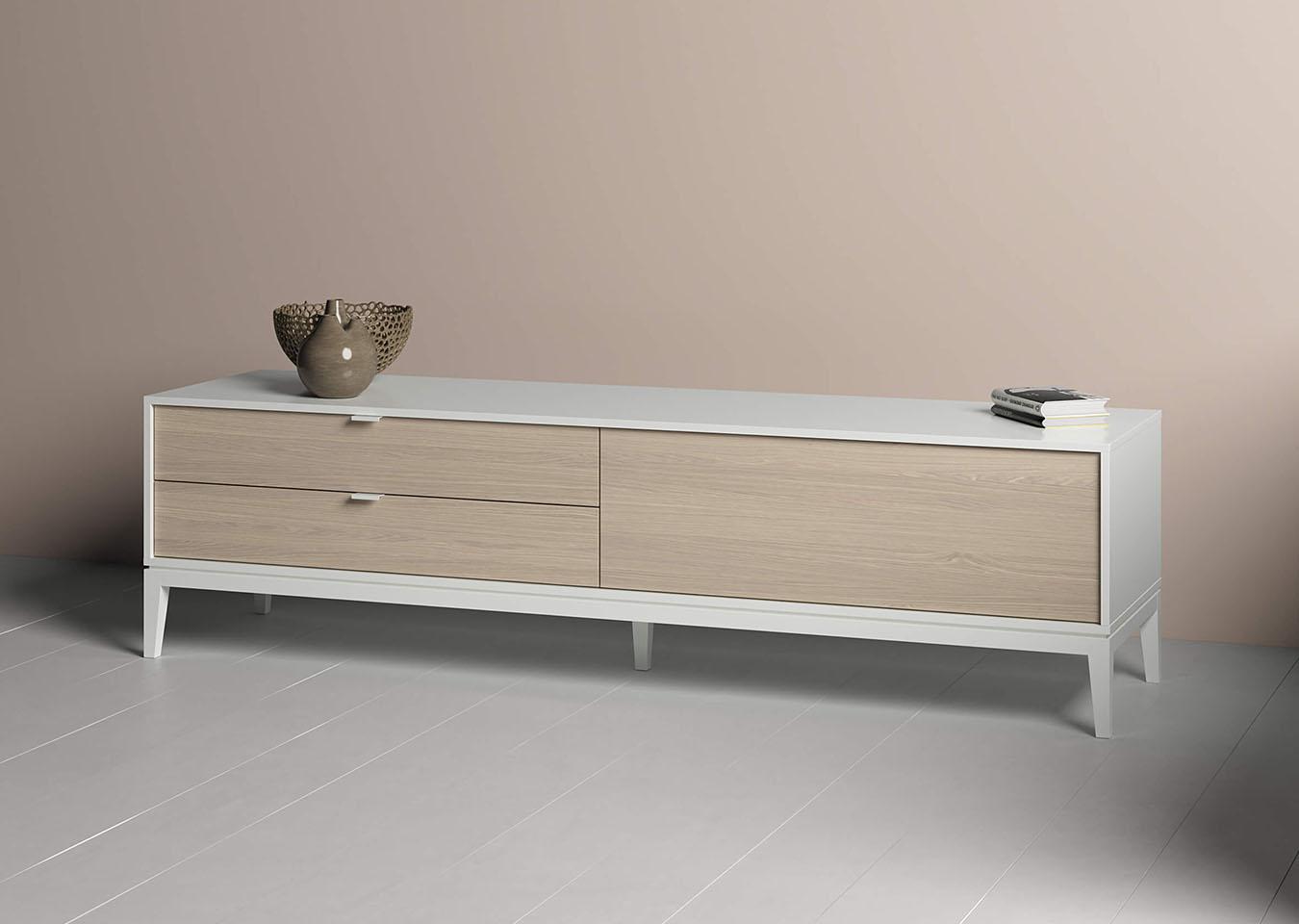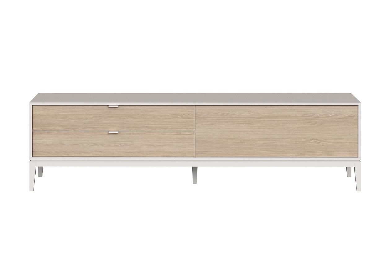 Тумба Fjord 1 дверь 2 ящика Высота: 54 см Ширина: 202 см Глубина: 51 см Основание: массива бука Корпус: МДФ под эмалью Фасады: шпон дуба