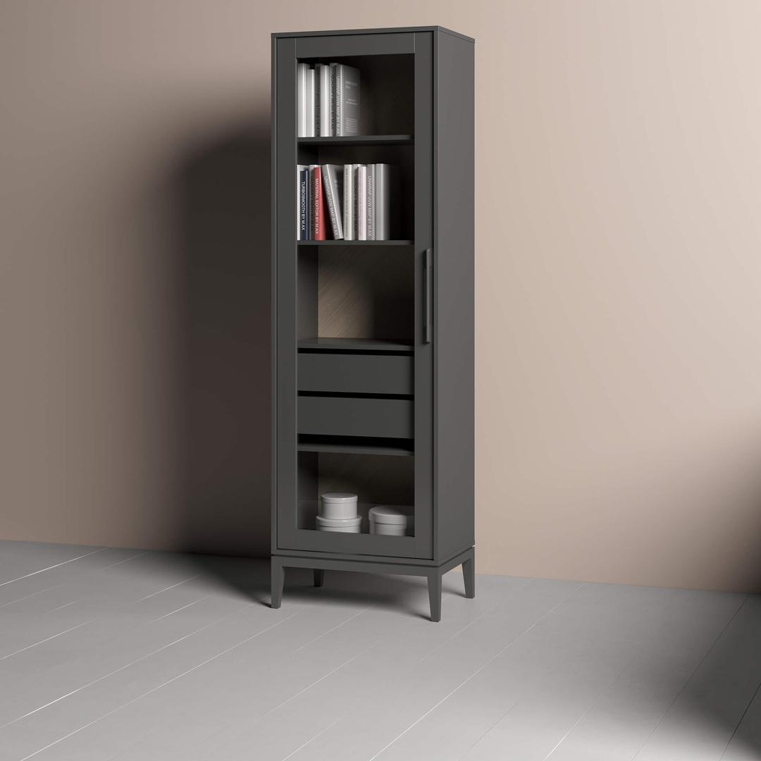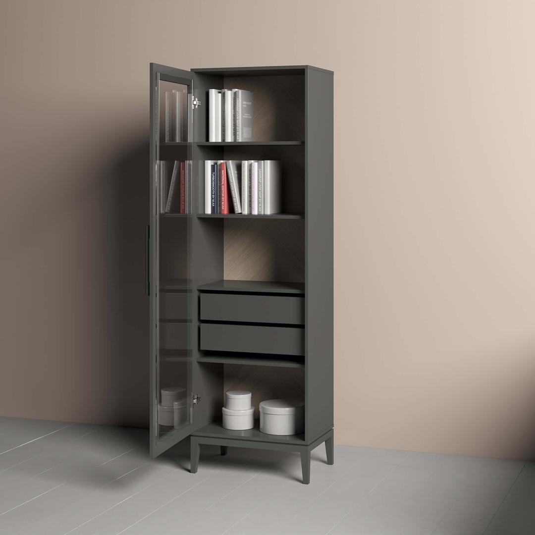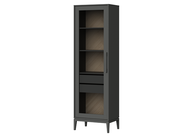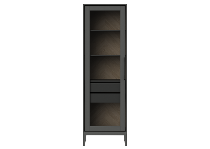 Витрина Fjord 2 ящика Высота: 202 см Ширина: 62 см Глубина: 42 см Основание: массива бука Корпус: МДФ под эмалью Фасады: шпон дуба Ящики на бесшумных направляющих с доводчиками