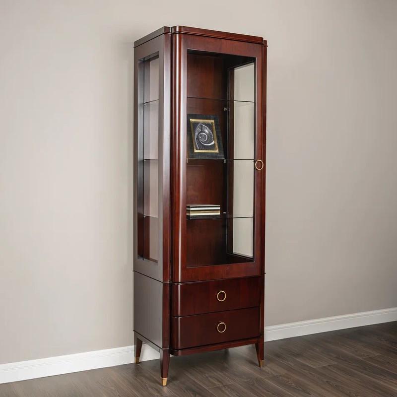 Изящная витрина Modena от итальянского бренда Fratelli Barri. Витрина в неоклассическом стиле. Идеально сочетается строгость четких геометрических форм и шпон вишни в отделке. Прекрасный внешний вид дополнен многофункциональностью витрины – имеется два выдвижных ящика и стеклянные полочки. Дверка универсальная - можно установить с левым и правым открыванием. Для удобства использования есть встроенная подсветка. На ножках металлические колпачки. Выполнена из массива дерева и высококачественного МДФ класса Е1. Цвет фурнитуры - латунь. Ящики оснащены доводчиками для плавного закрывания. Стеклянная дверка и полки из закаленного стекла.