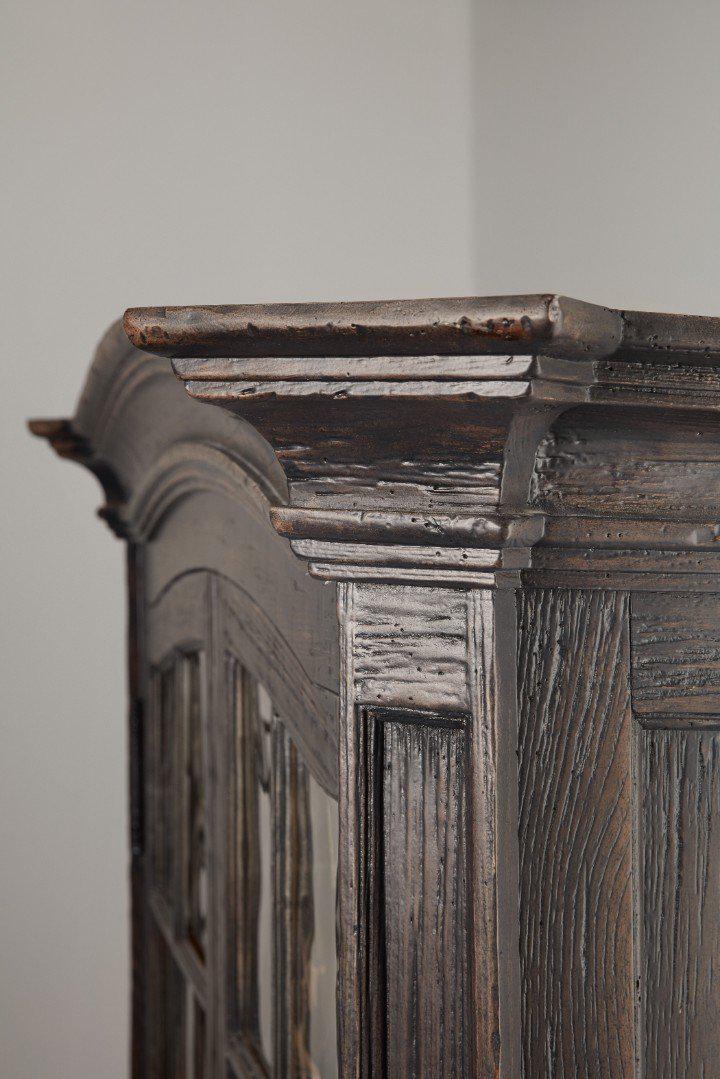 Витрина с двумя дверьми выполнена в традиционном стиле. Витрина изготовлена из шпона гикори, фанеры дуба с использованием антикварного стекла. Двери украшены вставками антикварного стекла. В витрине четыре полки - одна фиксированная полка и три регулируемые стеклянные полки в деревянном каркасе. Витрина оснащена подсветкой с сенсорным переключателем. Прекрасно будет смотреться в гостиной или кабинете.